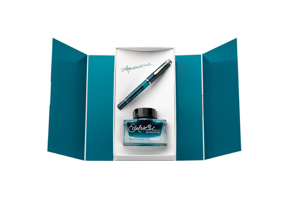 Im März hat Pelikan bereits die Edelstein® Ink of the Year Aquamarine auf den Markt gebracht. Der Farbton der Tinte definiert sich aus einem satten Blau gemischt mit einem intensiven Grün. Nun folgt die dazu passende limitierte Schreibgeräte Serie 205. Für die Umsetzung der Tintenfarbe wurde eine besondere Materialkomposition verwendet, die der Produktfarbe eine samt-matte Transparenz verleiht. Die Farbe erhält so eine hochwertige Tiefe und erlaubt gleichzeitig einen Einblick in das Innere des Schreibgeräts. Die Zierelemente wie Ring und Clip sind silberglänzend, die Schreibfeder des Kolbenfüllhalters ist eine hochglanzpolierte Edelstahlfeder. Je nach Wunsch ist die Edelstahlfeder in den Federbreiten EF, F, M und B erhältlich. Für jeden, der den Flash eines passenden Farbkonzepts genießen will, ist das Set bestehend aus einem M205 & einem Tintenglas Edelstein® Ink of the Year 2016 genau richtig. It´s all about Aquamarine. |