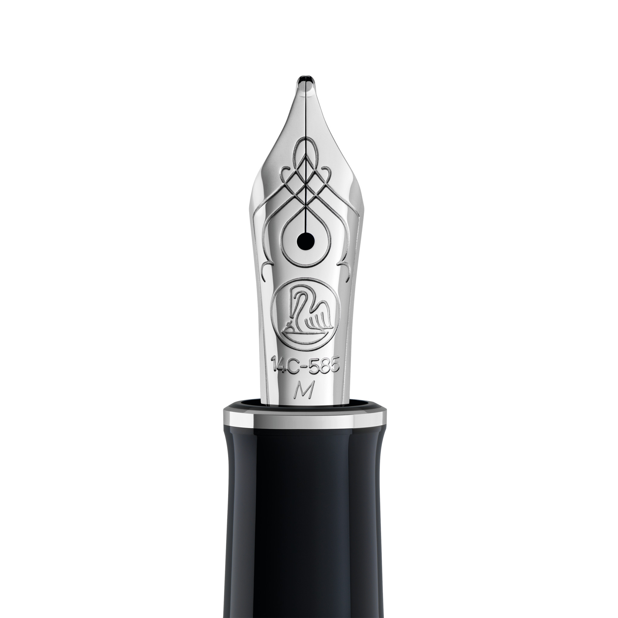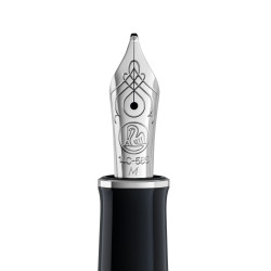 | Kernvorteile | Füllhalter mit Differentialkolbenmechanik ; 14-Karat komplett rhodinierte Goldfeder in medium-breiter Strichstärke ; Palladium veredelte Zierelemente ; Individuelles Streifenmaterial ; Hochglanz poliertes schwarzes Edelharz-Gehäuse ; Made in Germany |