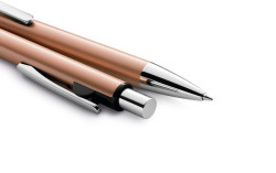 Kernvorteile | Zeitlos elegante Formsprache; Metallic Farben; Ergonomisch ausbalanciertes Gewicht; Einfacher Drückermechanismus; Laser- und Gravurfähig; nach ISO 12757-2 dokumentenechte Paste; 100% recyclebares Metall |