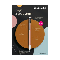 | Der Snap®-Kugelschreiber zeichnet sich durch seine formal klare Formsprache aus, die für Menschen mit einer Vorliebe für puristisch minimalistische Ästhetik gemacht ist. Dieser Designansatz wird mit einer perlmuttartigen Lackierung kombiniert, die den hochwertigen Gesamteindruck unterstreicht. Namensgebend für den Kugelschreiber mit Druckmechanik ist sein Clip. Beim Ausfahren der Mine schnappt er in die Drückermechanik ein. Durch Druck auf den oberen Teil des Clips wird die Mechanik entriegelt und die Mine eingefahren. Der Snap®-Kugelschreiber ist größtenteils aus recyclefähigem Metall gefertigt. Sowohl der Drücker als auch der Aluminium-Schaft sind zylindrisch geformt. Diese Form geht in die konische Messing-Spitze über. Die im Vergleich zu Aluminium schwere Messing-Spitze sorgt dafür, dass der Schwerpunkt zur Spitze verlagert wird, wodurch ergonomisch optimiertes Schreiben möglich wird. Das Gerät ist ausgestattet mit einer auswechselbaren Großraummine mit weicher Spitze (Größe M) und einer blauen, nach ISO 12757-2 dokumentenechten, Paste. Während Drücker, Clip und Spitze glänzend verchromt sind, ist der Aluminium-Schaft perlmuttartig lackiert. Dadurch erhält das Gerät seine metallisch-schimmernde Optik, die es in den Farben Silber, Platin, Gold, Rose-Gold, Kupfer und Frostblau gibt. |