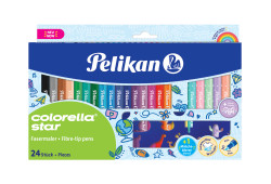 Fasermaler Colorella Star C 302, mit feiner Spitze. 24 Farben, davon 18 in kräftigen und 6 in zarten Pastell-Tönen. Kindgerechte Ausmalschablone inklusive. Stifte mit farbigen Kappen in der Faltschachtel. |