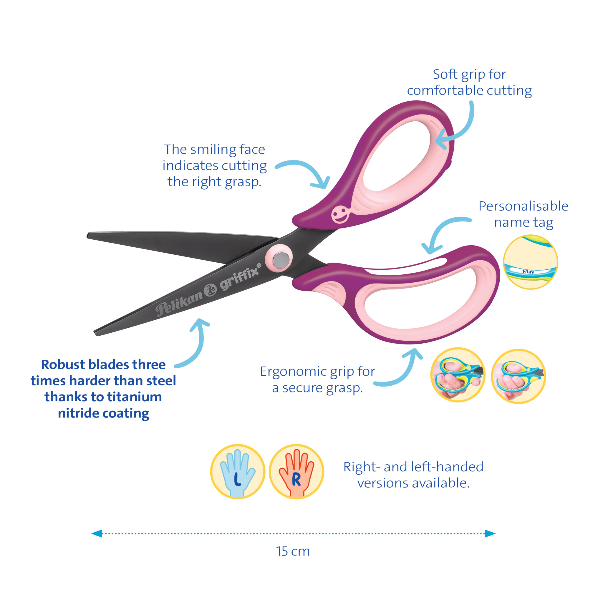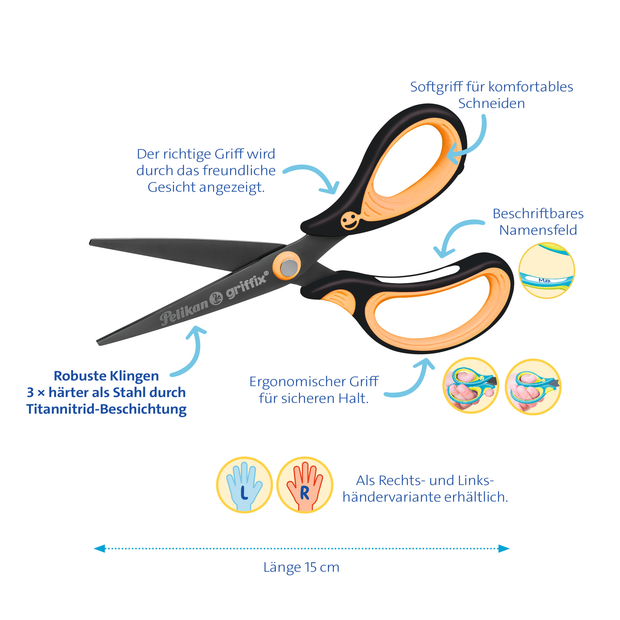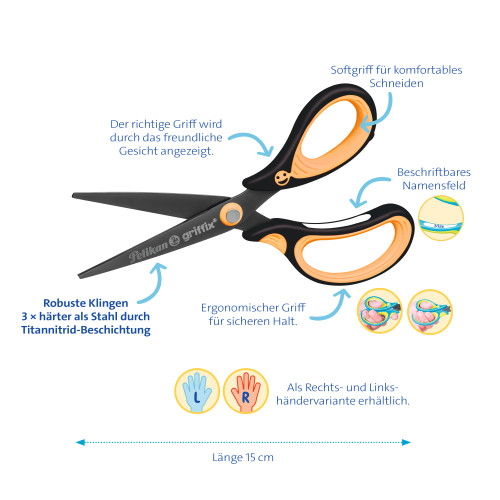 Die Klinge der Pelikan griffix Schulschere ist 3x härter als Stahl durch eine Titan-Nitrid-Beschichtung. Die spitze Klinge eignet sich besonders gut für kleinere, filigrane Schneid-Arbeiten. Der ergonomische Griff besteht aus hartem und weichem, hochwertigen Kunststoff und ist PVC- und Latex-frei. Wie beim beliebten griffix Schreiblernsystem sorgt das lachende Griffix Gesicht für die richtige Handhaltung. Mit Namensfeld. | |