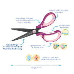 Kernvorteile | griffix® Schulschere mit spitzer Klinge; Für Rechtshänder; Ergonomische Griffzonen aus latexfreiem ABS Kunststoff; Zusätzliche Griffmulde; Kindgerechtes Design; Scherenblätter 3x härter als Stahl (mit Titannitrid-Beschichtung); Stoß- und kratzfrei; Fördert die Auge-Hand-Koordination; Lachendes griffix®-Gesicht für die richtige Handhaltung; Mit Namensfeld zur individuellen Beschriftung; Ideal für kleinere, filigrane Schneidarbeiten; Farben: Neon Fresh Blue, Neonblack und Sweetberry; Farbauswahl nicht möglich |