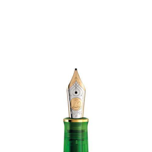 Souverän ist der Klassiker von Pelikan. Das grün-transparente Gehäuse wird in einer Reihe von Produktionsschritten aus hochwertigem Edelharz gefertigt und anschließend mit einem Diamanten auf Kontur geschliffen. Die einteiligen Kappen- und Füllgriffringe, mit glänzender und satinierter Oberfläche, verleihen diesem Füllhalter eine außergewöhnliche Optik. Die grün-transparenten Komponenten geben den Blick auf den Kolbenmechanismus und den Tintenstand frei. Der leicht federnde, typische Pelikan Schnabelclip verleiht diesem hochwertigen Schreibgerät sein unverwechselbares Design. Der Kolbenfüllhalter Souverän M800 verfügt über eine 18-Karat Bicolor-Goldfeder und ist in den Federbreiten EF, F, M und B erhältlich. Die F-Feder sorgt für ein feines Schriftbild und ist besonders für Handschriften mit kleineren Schwüngen geeignet. |