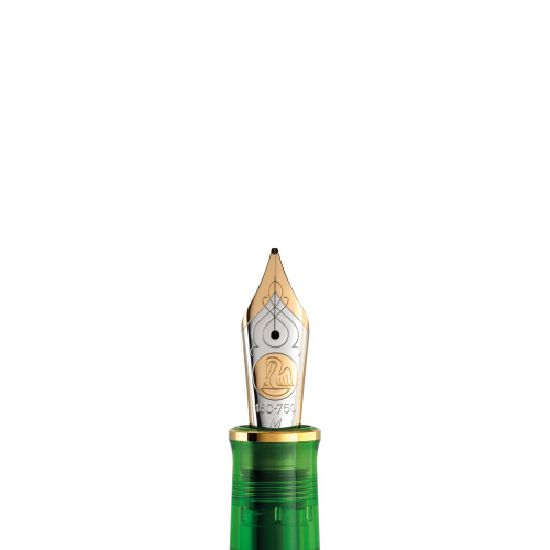 Souverän ist der Klassiker von Pelikan. Das grün-transparente Gehäuse wird in einer Reihe von Produktionsschritten aus hochwertigem Edelharz gefertigt und anschließend mit einem Diamanten auf Kontur geschliffen. Die einteiligen Kappen- und Füllgriffringe, mit glänzender und satinierter Oberfläche, verleihen diesem Füllhalter eine außergewöhnliche Optik. Die grün-transparenten Komponenten geben den Blick auf den Kolbenmechanismus und den Tintenstand frei. Der leicht federnde, typische Pelikan Schnabelclip verleiht diesem hochwertigen Schreibgerät sein unverwechselbares Design. Der Kolbenfüllhalter Souverän M800 verfügt über eine 18-Karat Bicolor-Goldfeder und ist in den Federbreiten EF, F, M und B erhältlich. Die M-Feder sorgt für ein medium-breites Schriftbild und ist besonders für Handschriften mit etwas größeren Schwüngen geeignet. |