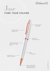 Der elegante Jazz Metall-Kugelschreiber zeichnet sich durch seine schwungvolle Linienführung aus, die leicht und lebendig wirkt. Das perlmutt-schimmernd lackierte Ober- und Unterteil harmoniert perfekt mit der im gleichen Farbton veredelten Spitze, Ring und Clip. Der Pelikan-typische Schnabelclip ist federnd gelagert und dadurch besonders robust. Der Dreh-Kugelschreiber ist ausgestattet mit einer Großraummine mit nach ISO 12757-2 dokumentenechter Paste in der Schreibfarbe Blau. | |