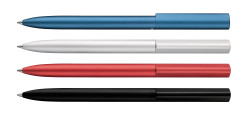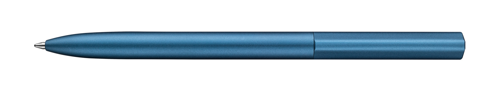 Kernvorteile | Metall-Kugelschreiber mit Drehmechanik; Puristische, Clip-lose Ausführung; Perlmutt-schimmernd eloxiertes Ober- und Unterteil; Schlanke Form; Ausgestattet mit wechselbarer Großraum-Mine; Blaue, nach ISO 12757-2 dokumentenechte Paste |