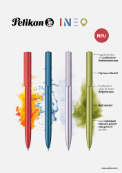 Einzigartig und unverwechselbar auffallend - das ist INEO, die neue Schreibgeräte-Serie von Pelikan. Sie zeichnet sich durch Ihre außergewöhnliche Formsprache aus. Dabei sorgt die sandgestrahlte Oberfläche für ein mattes Finish der farblich eloxierten Geräte, die im Licht perlmuttartig schimmert. Ihr Look & Feel ist angelehnt an den Minimalismus mit seiner reduzierten Formsprache, ruhigen Farben und der hochwertigen Verarbeitung von natürlichen Materialien. Ein besonderes Highlight dieser Metall-Schreibgeräte ist das cliplose Design. So bleibt die Konzentration bei dem Wesentlichen – den Gedanken, die zu Papier gebracht werden sollen. Das unterscheidet sie von anderen Schreibgeräten ihrer Art und macht sie zu Hingucker im Alltag. Den INEO gibt es aktuell als Patronen-Füllhalter und Dreh-Kugelschreiber. Zur Auswahl stehen 6 Trendfarben: Clearing Breeze (Silber), Black Rock (Schwarz), Ocean-Blue (Petrol-Blau), Lavender Scent (Lila-Violett), Fiery-Red (Rot) und Green Oasis (Grün). |