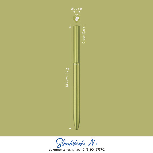 Kernvorteile | Metall-Kugelschreiber mit Drehmechanik; Puristische, Clip-lose Ausführung; Perlmutt-schimmernd eloxiertes Ober- und Unterteil; Schlanke Form; Ausgestattet mit wechselbarer Großraum-Mine; Blaue, nach ISO 12757-2 dokumentenechte Paste |