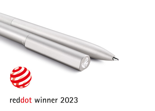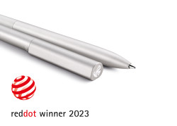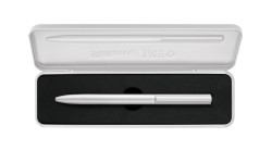 | Kernvorteile | Metall-Kugelschreiber mit Drehmechanik; Puristische, Clip-lose Ausführung; Perlmutt-schimmernd eloxiertes Ober- und Unterteil; Schlanke Form; Ausgestattet mit wechselbarer Großraum-Mine; Blaue, nach ISO 12757-2 dokumentenechte Paste |