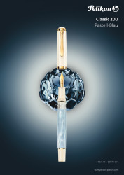Eine neue Leichtigkeit. Ein softes pastell-blau verwirbelt mit Perleffekten im Schaft und zaubert so immer neue Varianten des Farbtons. Das zart-blaue Material ist semi-transparent und lässt so einen Blick in das Innere des Füllhalters zu. In Kombination mit dem weißen Edelharz und den vergoldeten Zierelementen ergibt sich eine ausgewogene Balance zwischen edlem Design und einer erfrischende Farbimpression. Der Kolbenfüllhalter ist mit 24ct vergoldeten Zierelementen wie Ringe und dem Pelikan Schnabelclip veredelt. Der Füllhalter, mit seiner ebenfalls vergoldeten Edelstahlfeder, bietet ein weiches Schreibgefühl. Die Federbreite M ist als medium Strichbreite für viele Handschriften gut geeignet und passt sich auch gut der Schreibweise an, wenn man in das Schreiben mit den Füllhalter erst einsteigt.