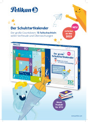 NEU: Der Kalender für den Schulstart. Der große Countdown zum Schulbeginn! 15 Faltschachteln mit Schulanfangsprodukten, um die aufregende Zeit bis zum Schulstart zu verkürzen. Eine tolle Überraschung für alle Erst- oder Zweitklässler. Mit vielen kindersicheren Pelikan Markenprodukten für die Schule oder Zuhause. Inhalt: griffix ergonomische Schulschere griffix ergonomischer Schulpinsel 5 griffix ergonomische Wachsmaler ergonomischer, dicker Schreiblernbleistift Combino Lineal Radierer Doppeldosenanspitzer "Flower" Klebestift Pelifix 10g Textmarker 490 Pastell "Softorange" Deckfarbkasten Ersatzfarbe Buchetiketten ... und Stundenplan mit Stickern und Broschüre mit Schulanfangstipps. Auf den Faltschachteln sind außedem kreative Basteltipps enthalten, die über einen QR-Code auf der Pelikan website abrufbar sind. Die meisten Produkte finden sich auf den Schulzetteln der Grundschulen wieder: Alles sinnvolle und vor allem sichere Schulprodukte für kleine Kinderhände. Vieles ist aus der beliebten Pelikan griffix-Familie mit ergonomischen Eigenschaften enthalten. Weil der Anfang wichtig ist! |