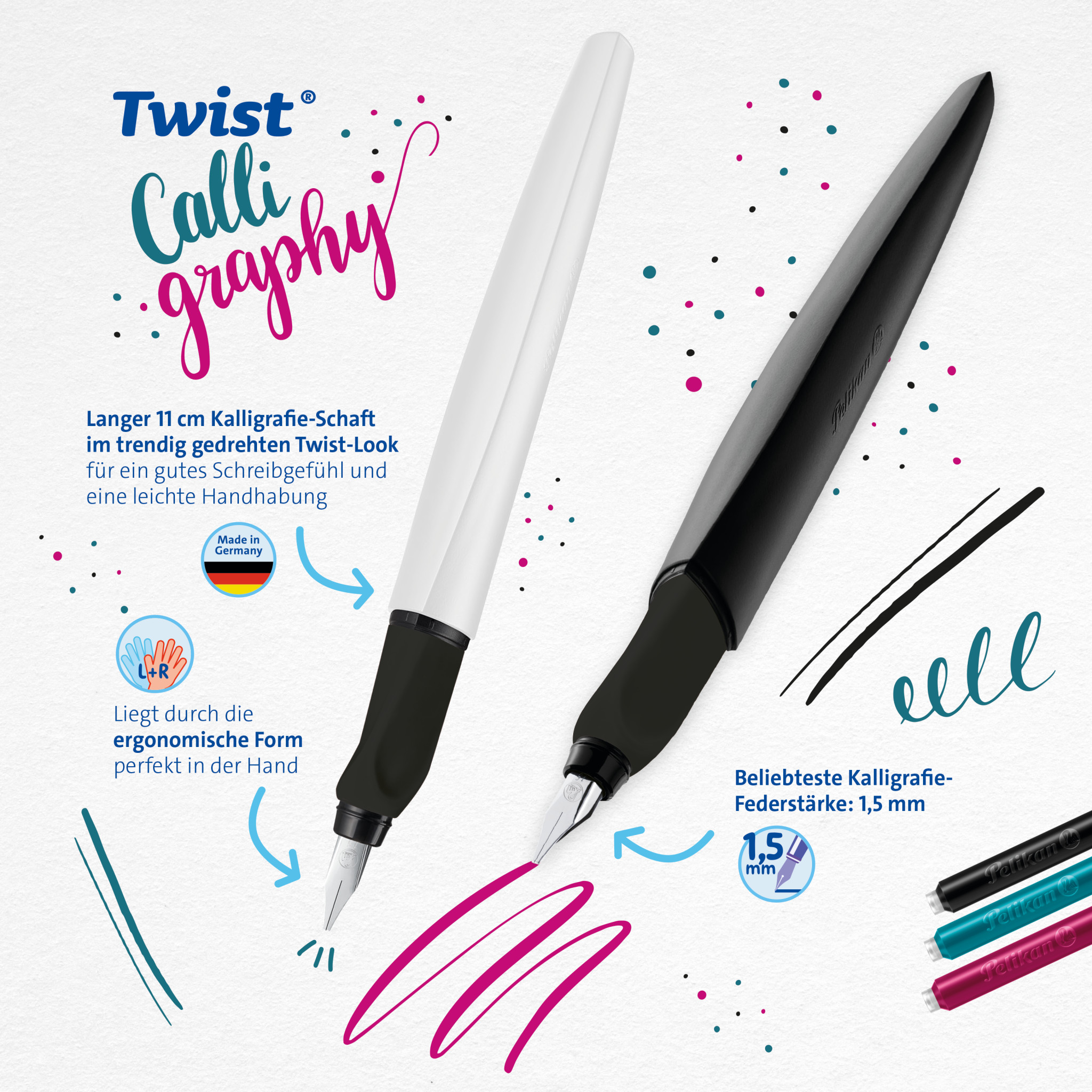 Kernvorteile | Kalligrafie-Füller mit Patronenfüllsystem; Universell für Rechts- und Linkshänder; Einzigartig gedrehter Look; In trendiger Farbkombination; Ergonomische Form liegt perfekt in der Hand; Ideal für längeres Schreiben; Sanft gleitende Edelstahlfeder; Kratzfreies Schreibgefühl; Inkl. einer Tintenpatrone; Federstärke: 1,5mm; Farbe: Weiß; Made in Germany; Faltschachtel aus FSC Mix Material |