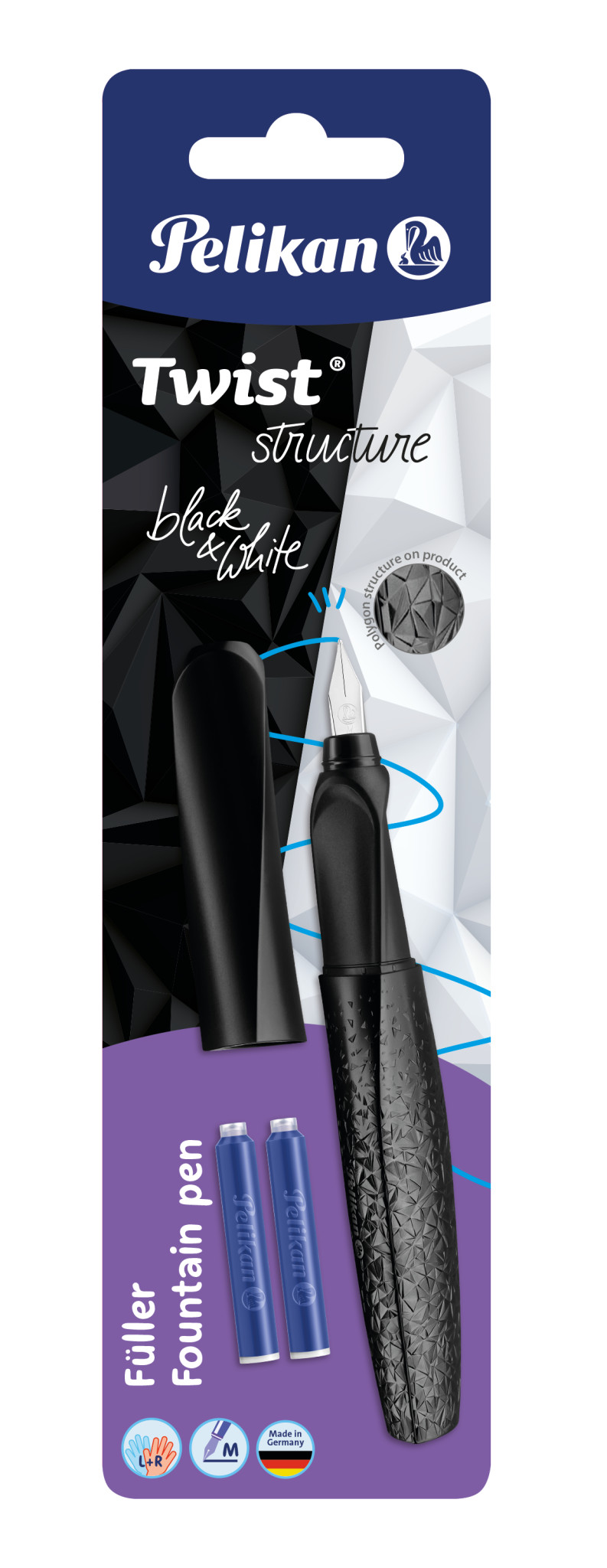 Kernvorteile | Füller mit Patronenfüllsystem; Universell für Rechts- und Linkshänder; Einzigartig gedrehter Look; In trendiger Farbkombination; Ergonomische Form liegt perfekt in der Hand; Ideal für längeres Schreiben; Sanft gleitende Edelstahlfeder; Kratzfreies Schreibgefühl; Inkl. einer Tintenpatrone; Federstärke: M; Farbe: White und Black; Made in Germany; Blisterkarte aus FSC Mix Material |