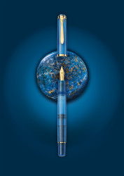 Das faszinierende Blau des M200 Golden Lapis nimmt den goldenen Schimmer auf und verzaubert mit einer schimmernden Präsenz. Gleichzeitig gibt die samtmatttransparente Materialkomposition den Blick auf das Innere, die Kolbenmechanik, frei. Werden die golden-schimmernden Elemente in der Tinte vor dem Befüllen aufgeschüttelt, verleihen sie so dem Geschriebenen immer wieder changierende Farbexpressionen. Die fein verarbeitete Edelstahlfeder und die Zierelemente sind hochwertig in 24kt vergoldet. Je nach individueller Handschrift und eigenem Schreib-Wohlgefühl ist der Füllhalter M200 Golden Lapis in den Federbreiten EF, F, M, B erhältlich.