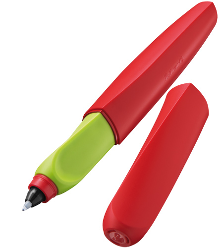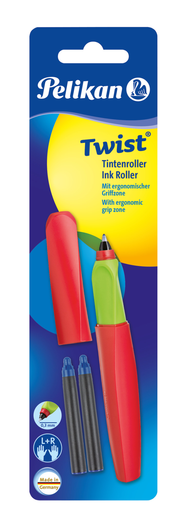 Der Pelikan Tintenroller Twist ist das Trendschreibgerät für junge Leute aus dem Traditionshaus Pelikan. Durch seinen gedrehten Look und die trendigen Farbkombinationen ist der Tintenroller ein echter Hingucker in jeder Federtasche. Die Twist Füllhalter und Roller bestechen durch ihr trendiges Design und ihre auffällige Zweifarbigkeit, wenn die Geräte geöffnet sind. Damit die Nutzer auch beim Schreiben strahlen können, greift der Twist die Farb-Trends aus dem Fashion- und Lifestylebereich auf. Ob fancy oder eher klassisch, den Pelikan Twist gibt es für jeden Geschmack garantiert in der passenden Farbkombination. Aufgrund ihrer einzigartig gedrehten Form und ihres ergonomischen Griffprofils liegen die Twist Schreibgeräte auch bei längerem Schreiben perfekt in der Hand – und das bei Links- und Rechtshändern gleichermaßen. Dem Twist Tintenroller liegt standardmäßig eine königsblaue Pelikan Tintenpatrone mit löschbarer Tinte bei. Diese Tinte lässt sich bei kleinen Schreibfehlern problemlos durch einen Tintenlöscher von Pelikan rückgängig machen. Alle Twist Trendschreibgeräte mit ihrem gedrehten Look und ihrer ergonomischen Form werden in Deutschland gefertigt. Qualität made in Germany – Made by Pelikan. Die Twist Tintenroller der Color Edition kommen auf passender Blister mit zwei königsblauen Tintenrollerpatronen inklusive.