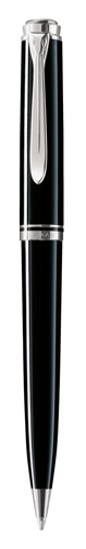Souverän ist der Klassiker von Pelikan. Das hochglänzende schwarze Gehäuse wird in einer Reihe von Produktionsschritten aus hochwertigem Edelharz gefertigt und anschließend mit einem Diamanten auf Kontur geschliffen. Die palladinierten Ringe am Ober- und Unterteil werden mit höchster Präzision eingepasst, bevor das Schreibgerät auf Hochglanz poliert wird. Der leicht federnde, typische Pelikan Schnabelclip verleiht diesem hochwertigen Schreibgerät sein unverwechselbares Design. Der Drehkugelschreiber Souverän K805 ist mit einer Großraummine in der Schreibfarbe schwarz ausgestattet.
