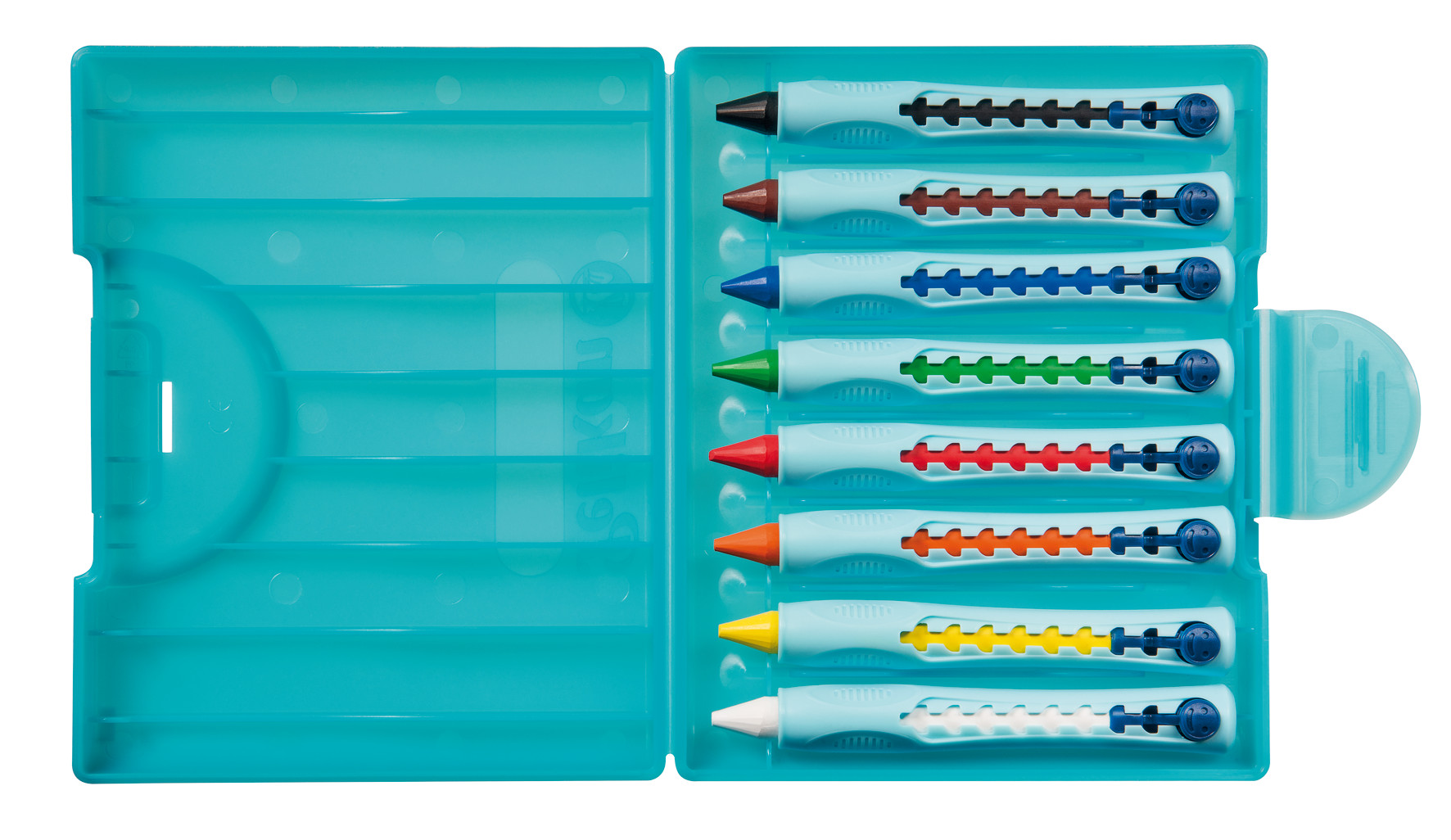 Kernvorteile | 8 griffix® Wachsschreiber mit Schiebehülse; Universell für Rechts- und Linkshänder; Zum Erlernen der Stifthaltung und Druckkontrolle; Ergonomische Griffzone; Wasservermalbar; Im praktischen Kunststoff-Etui; Mit Namensfeld für die individuelle Beschriftung; Mit Lehrern und Wissenschaftlern entwickelt; Farben: Weiß, Gelb, Orange, Rot, Grün, Blau, Braun, Schwarz; Made in Germany |