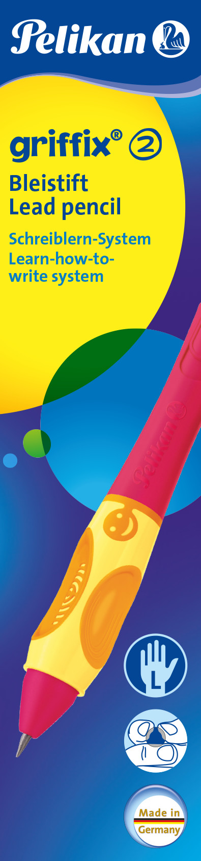 Der griffix® Bleistift ist ein Druckbleistift und die 2. Stufe des vierstufigen griffix® Schreiblernsystems. Die weiche HB Mine trägt zu einem sauberen Schriftbild bei. Das Gute-Laune-Gesicht zeigt, dass der Stift richtig gehalten wird. Passend dazu bietet Pelikan als Zubehör griffix® Anspitzer und griffix® Radierer an. Das ergonomische Design der griffix® Schreibgeräte fördert die richtige Handhaltung für natürliches und lockeres Schreiben in jeder Lernphase, denn alle Stifte – vom Wachsschreiber über Bleistift und Tintenroller bis hin zum Schulfüller - sind optimal auf die individuelle Lernstufe des Kindes angepasst. Dank des einheitlichen Griffmulden-Konzepts (Zangengriff) muss bei dem aufeinander aufbauenden Schreiblernsystem die Handhaltung von Stufe zu Stufe nicht mehr verändert werden. griffix® unterstützt die Kinderhand damit optimal im gesamten Schreiblern-Prozess - von Anfang an. Mit griffix® macht das Schreibenlernen Spaß. |