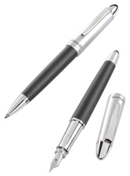 Schreibgeräte-Set bestehend aus einem Patronen-Füllhalter und einem Kugelschreiber. Der attraktive Patronen-Füllhalter ist mit einer Edelstahlfeder in der Federstärke M (medium) und der Druckkugelschreiber mit einer Großraummine ausgestattet. Das Schreib-Set in de r Farbkombination Schwarz-Silber wird in einem Metalletui geliefert.