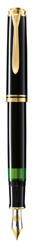 Souverän ist der Klassiker von Pelikan. Das hochglänzende schwarze Gehäuse wird in einer Reihe von Produktionsschritten aus hochwertigem Edelharz gefertigt und anschließend mit einem Diamanten auf Kontur geschliffen. Die vergoldeten Ringe an Füllgriff und Kappe werden mit höchster Präzision eingepasst, bevor das Schreibgerät auf Hochglanz poliert wird. Der leicht federnde, typische Pelikan Schnabelclip verleiht diesem hochwertigen Schreibgerät sein unverwechselbares Design. Der Kolbenfüllhalter Souverän M600 verfügt über eine 14-Karat Bicolor-Goldfeder und ist in den Federbreiten EF, F, M und B erhältlich. Die M-Feder sorgt für einen medium-breites Schriftbild und ist besonders für Handschriften mit etwas größeren Schwüngen geeignet. |