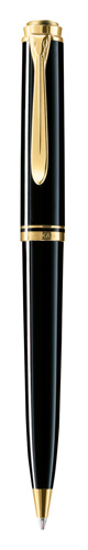 Souverän ist der Klassiker von Pelikan. Das hochglänzende schwarze Gehäuse wird in einer Reihe von Produktionsschritten aus hochwertigem Edelharz gefertigt und anschließend mit einem Diamanten auf Kontur geschliffen. Die vergoldeten Ringe am Ober- und Unterteil werden mit höchster Präzision eingepasst, bevor das Schreibberät auf Hochglanz poliert wird. Der leicht federnde, typische Pelikan Schnabelclip verleiht diesem hochwertigen Schreibgerät sein unverwechselbares Design. Der Drehkugelschreiber Souverän K600 ist mit einer Großraummine in der Schreibfarbe schwarz ausgestattet.