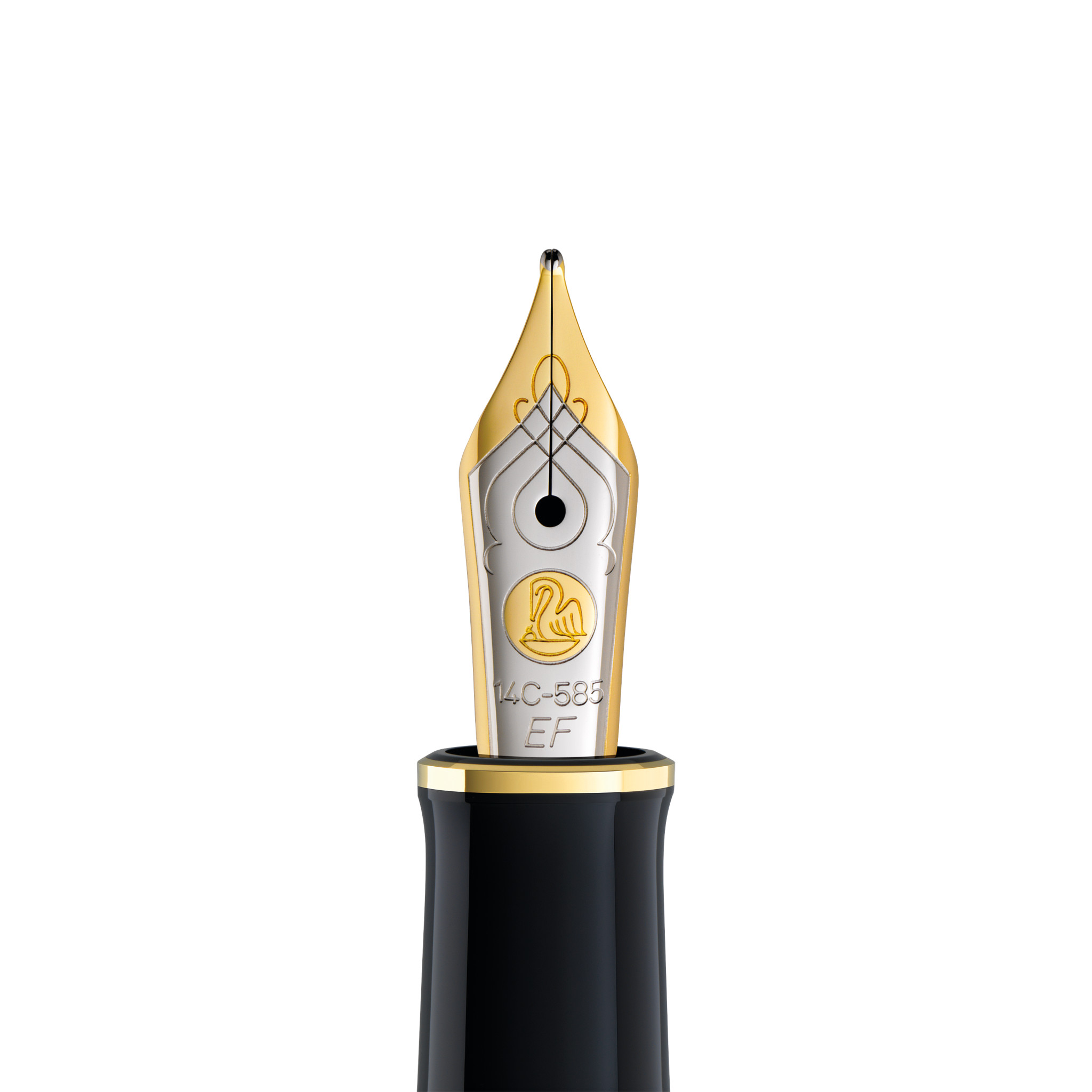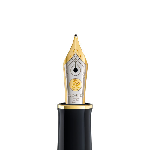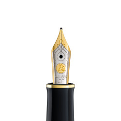 Souverän ist der Klassiker von Pelikan. Das hochglänzende schwarze Gehäuse wird in einer Reihe von Produktionsschritten aus hochwertigem Edelharz gefertigt und anschließend mit einem Diamanten auf Kontur geschliffen. Die vergoldeten Ringe an Füllgriff und Kappe werden mit höchster Präzision eingepasst, bevor das Schreibgerät auf Hochglanz poliert wird. Der leicht federnde, typische Pelikan Schnabelclip verleiht diesem hochwertigen Schreibgerät sein unverwechselbares Design. Der Kolbenfüllhalter Souverän M400 verfügt über eine 14-Karat Bicolor-Goldfeder und ist in den Federbreiten EF, F, M und B erhältlich. Die EF-Feder sorgt für ein extra-feines Schriftbild und ist besonders für Handschriften mit kleinen Schwüngen geeignet.