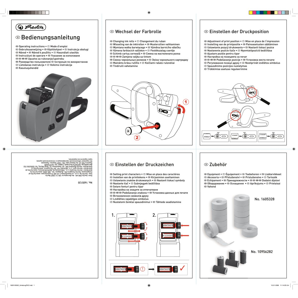 Description: | Wechsel der Farbrolle, Einstellung der Druckposition, Einstellen der Druckzeichen, Zubehör, Etiektten einlegen |