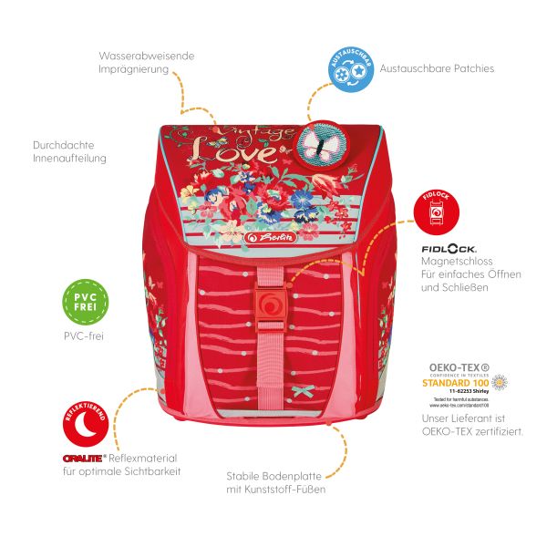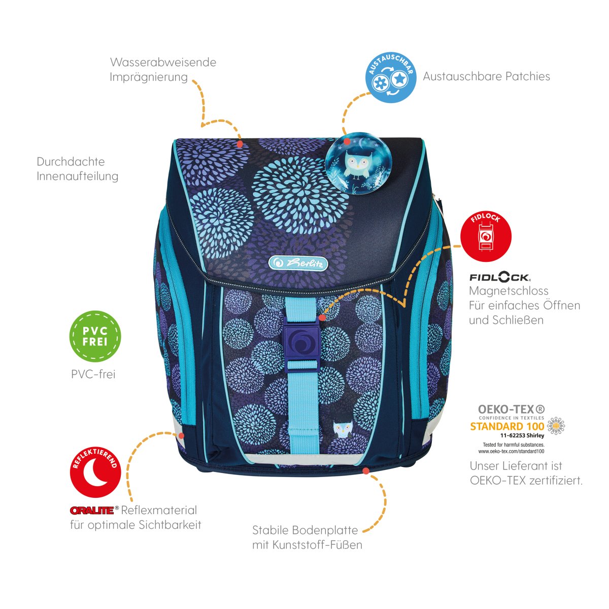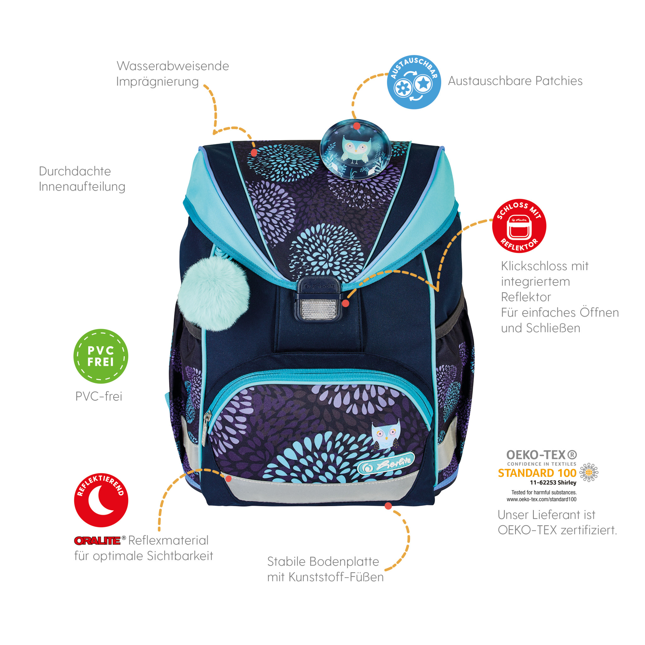 Schoolbag FiloLight Flower Owl front, with Key Facts DE |