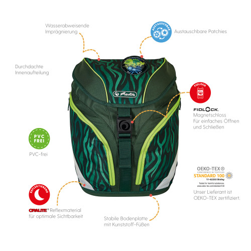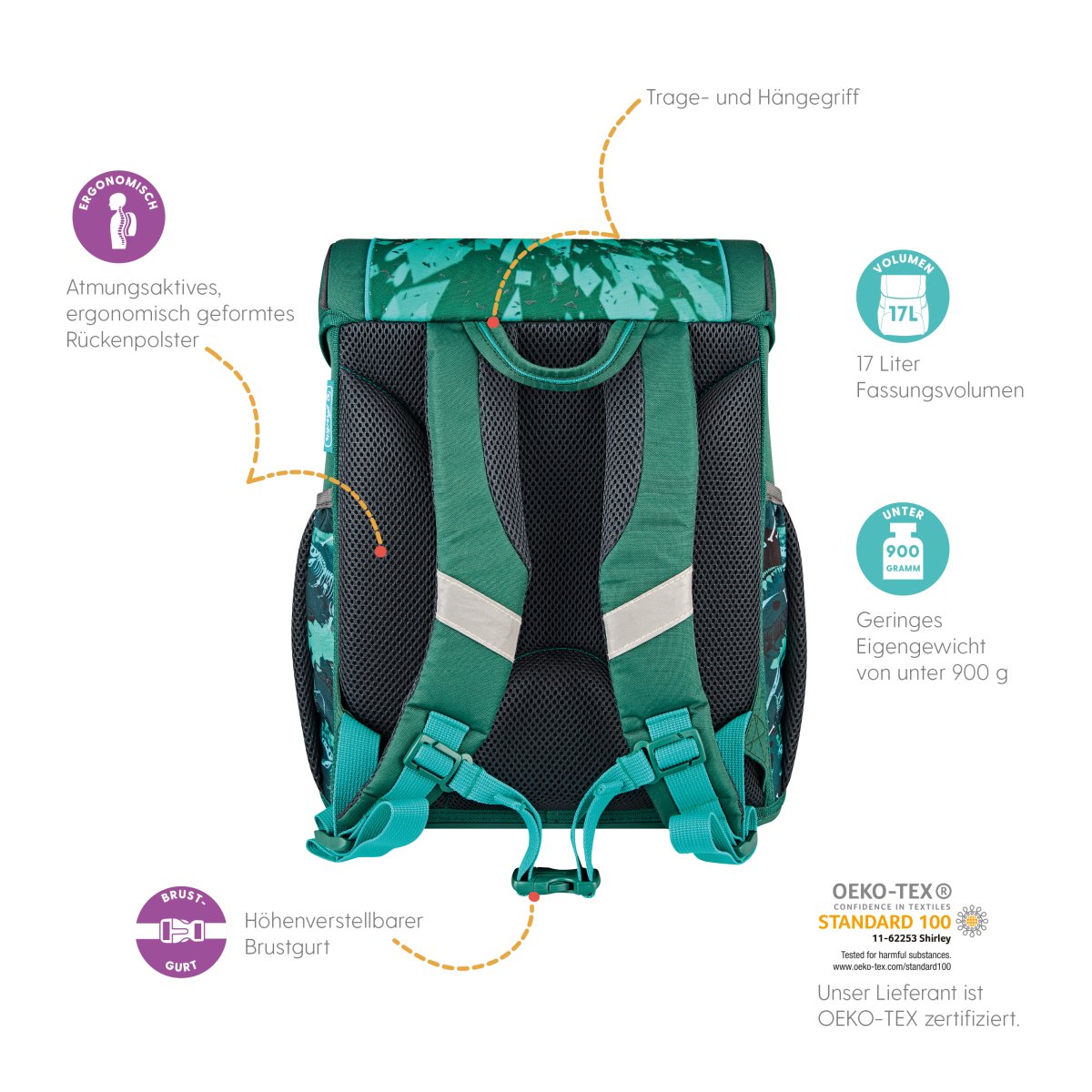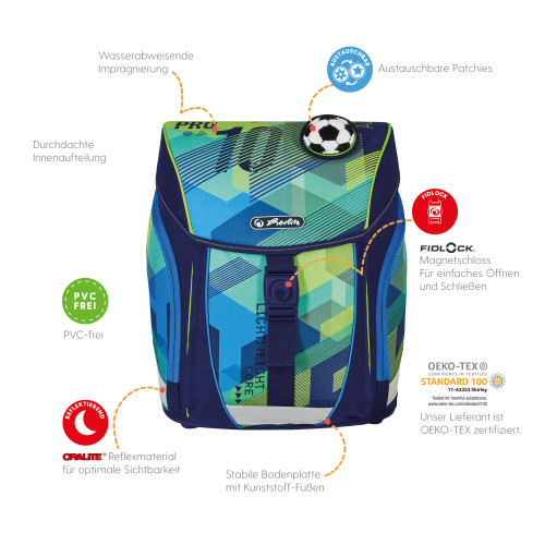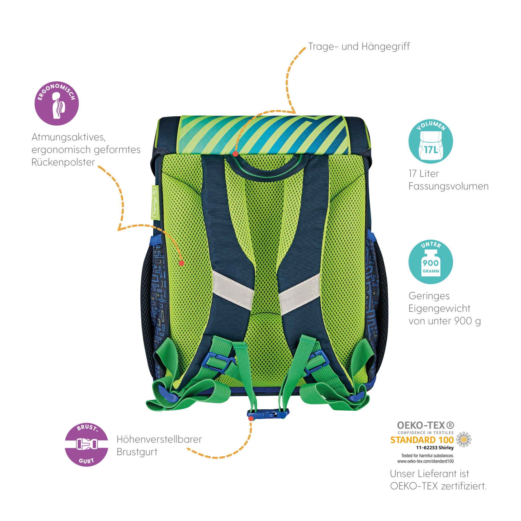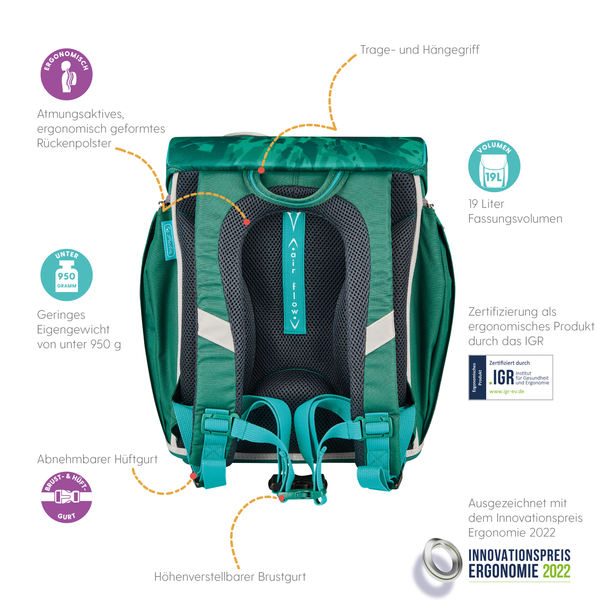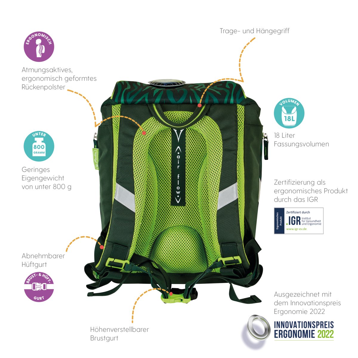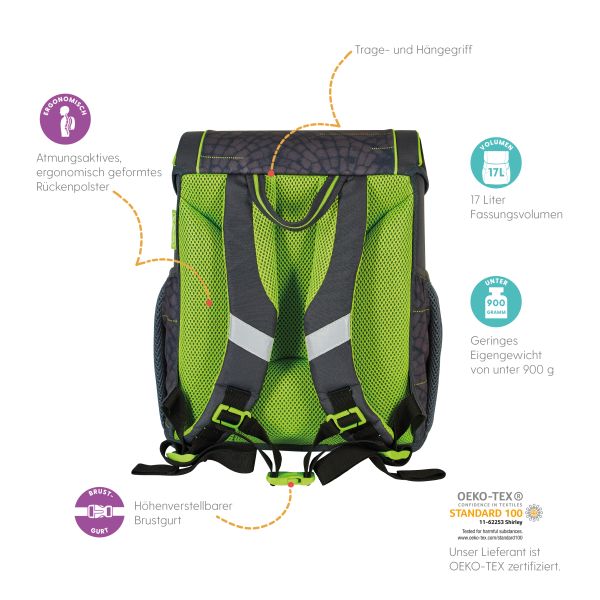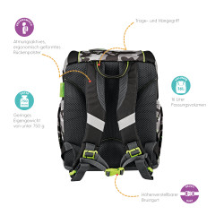Schulranzen FiloLight Green Goal Vorderseite, mit Key Facts DE |