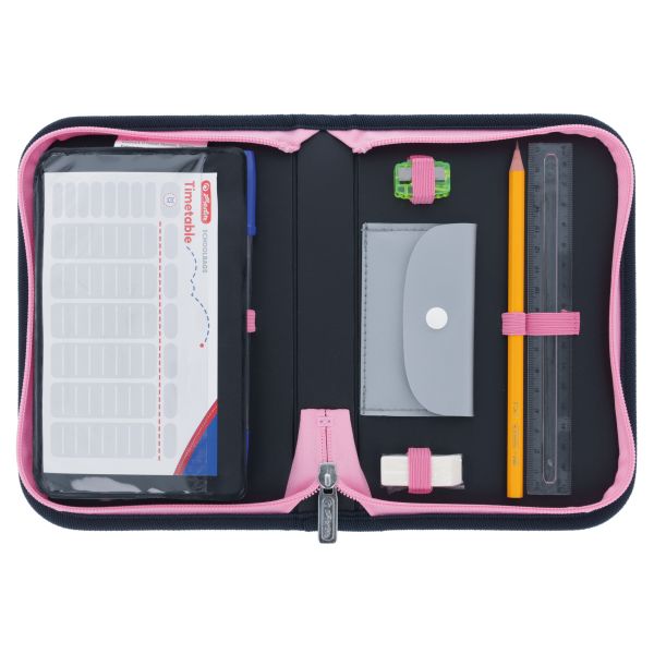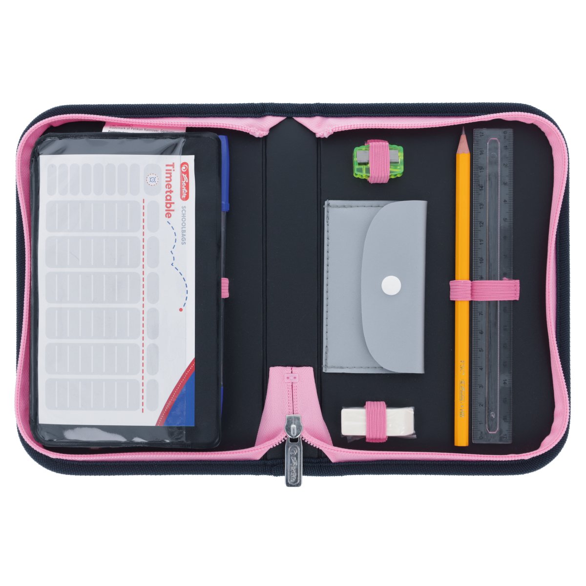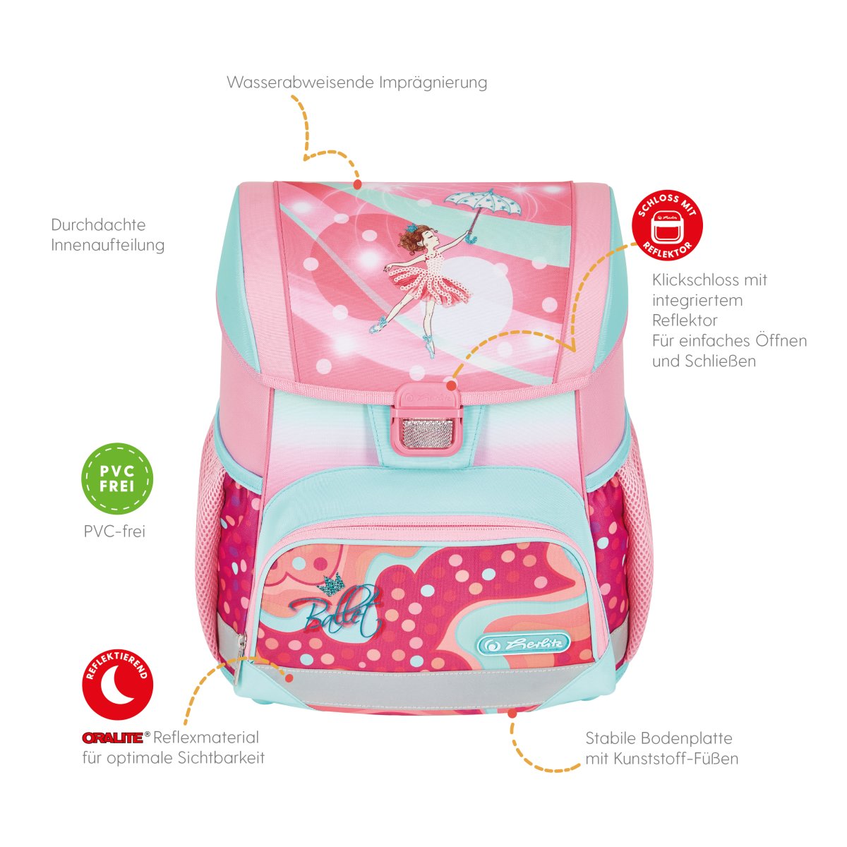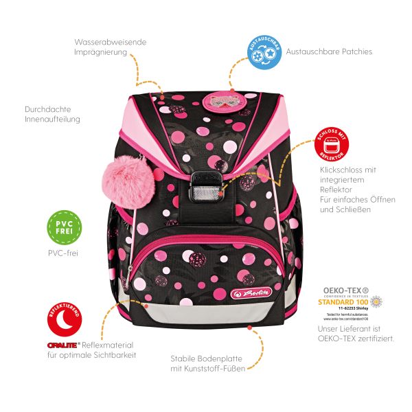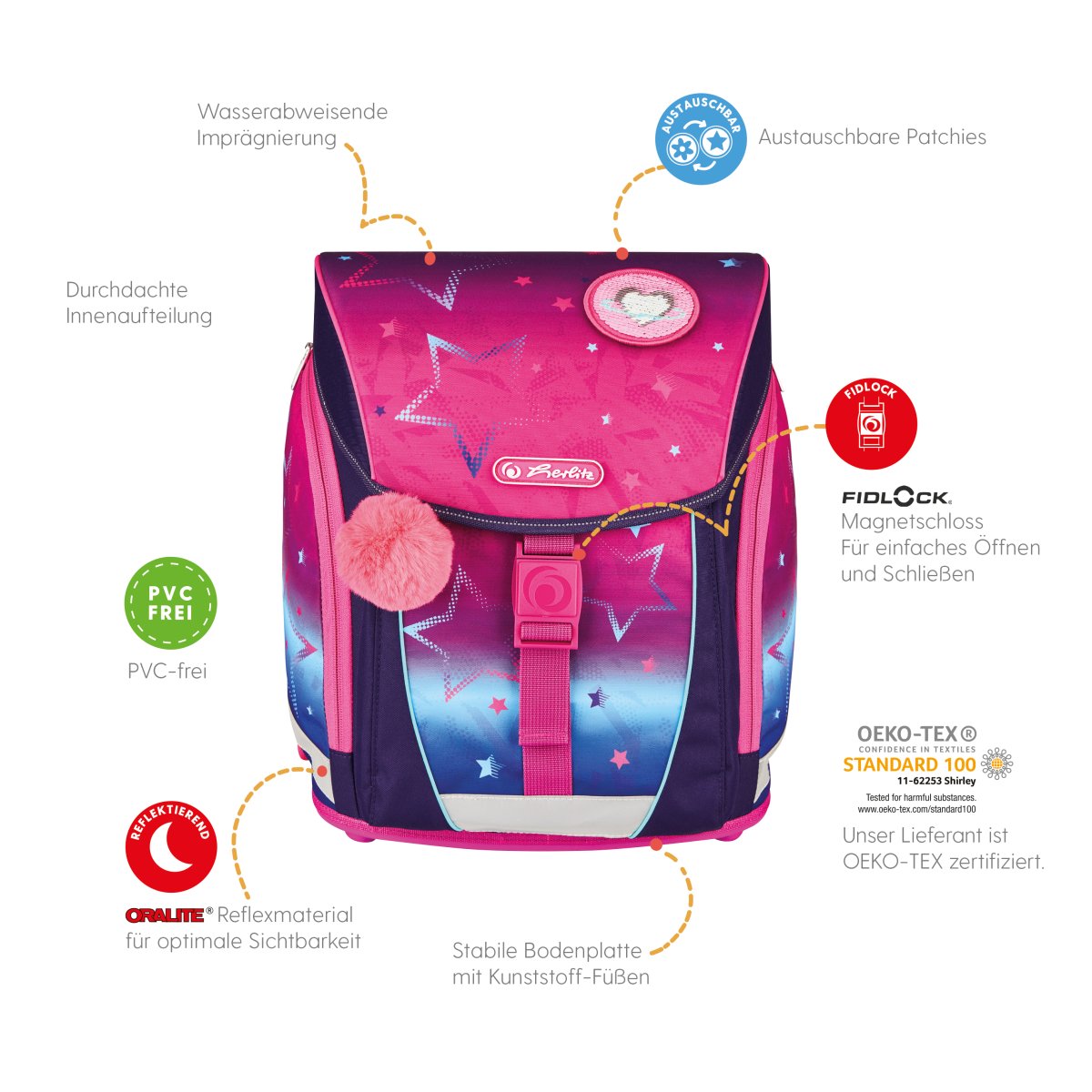 Schoolbag FiloLight Pink Stars front, with Key Facts DE |