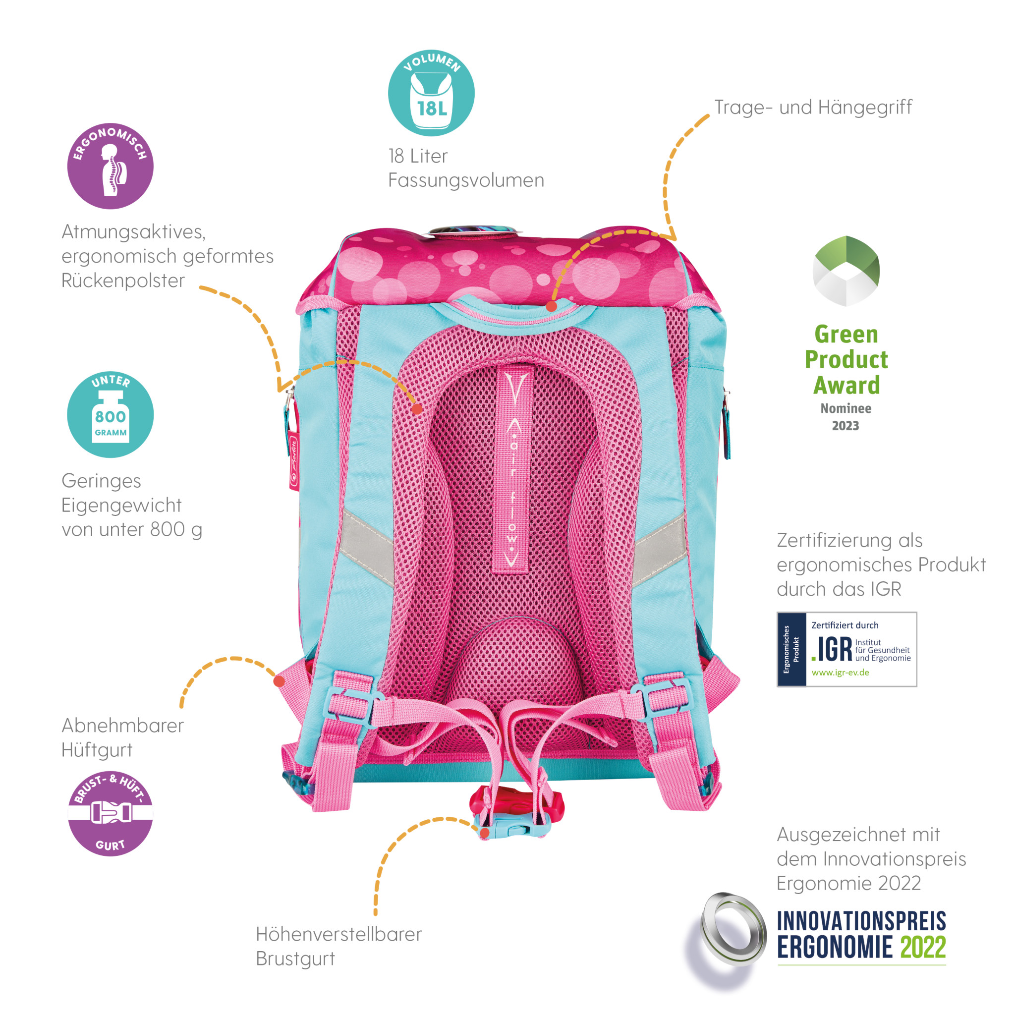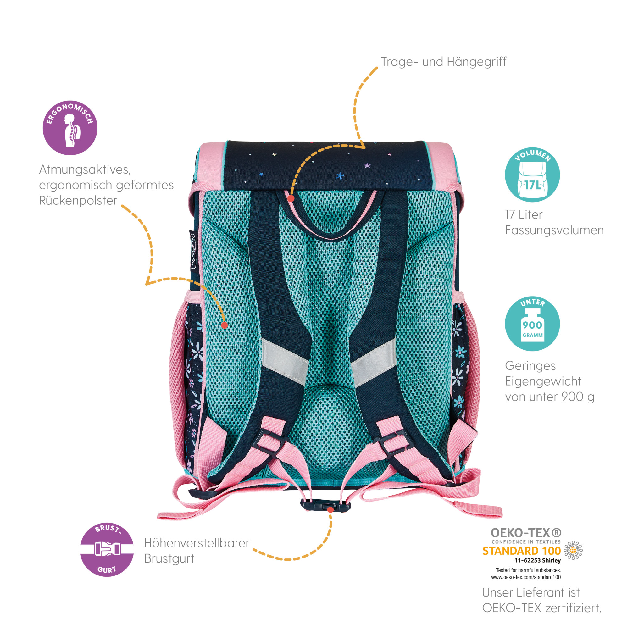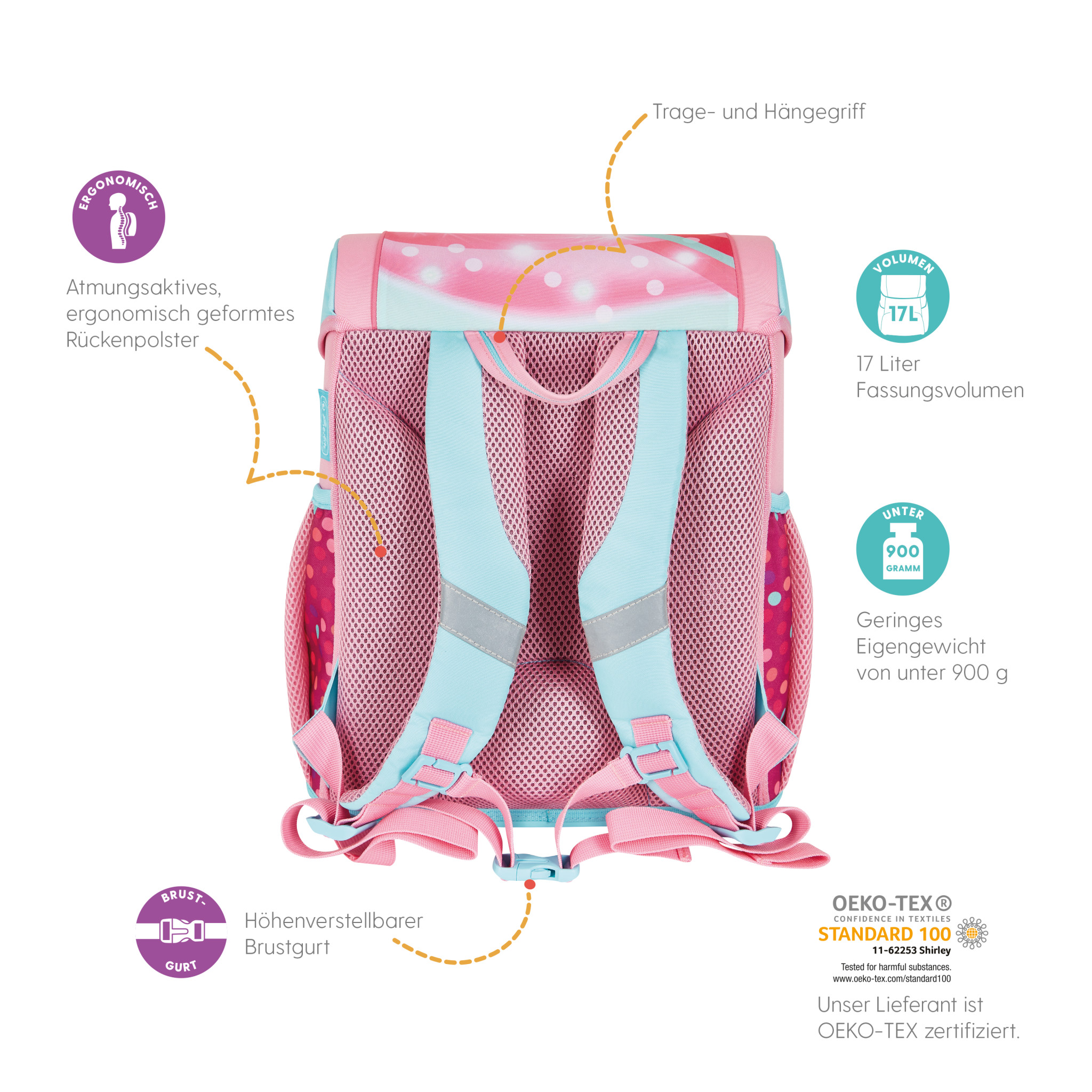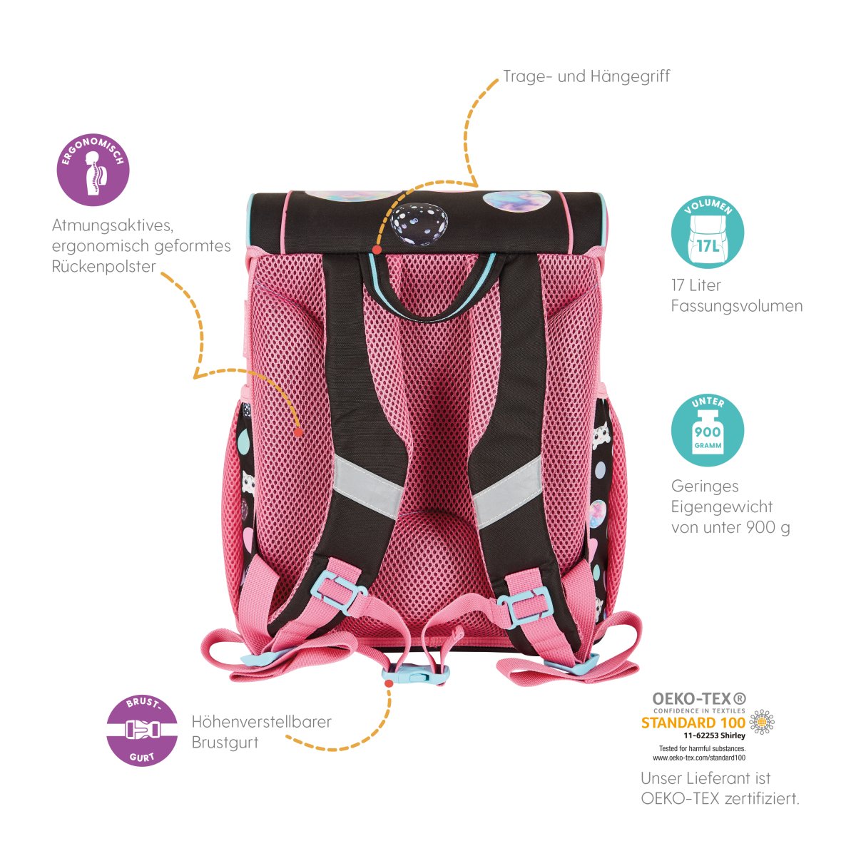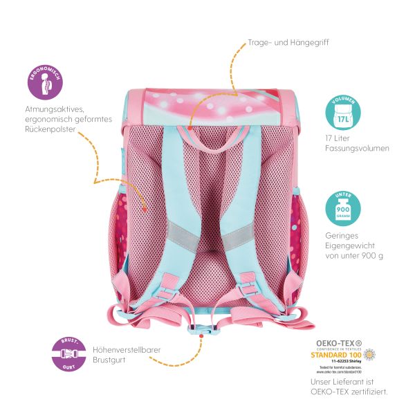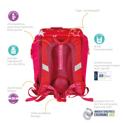 Schoolbag FiloLight Pink Stars backside, with Key Facts DE |