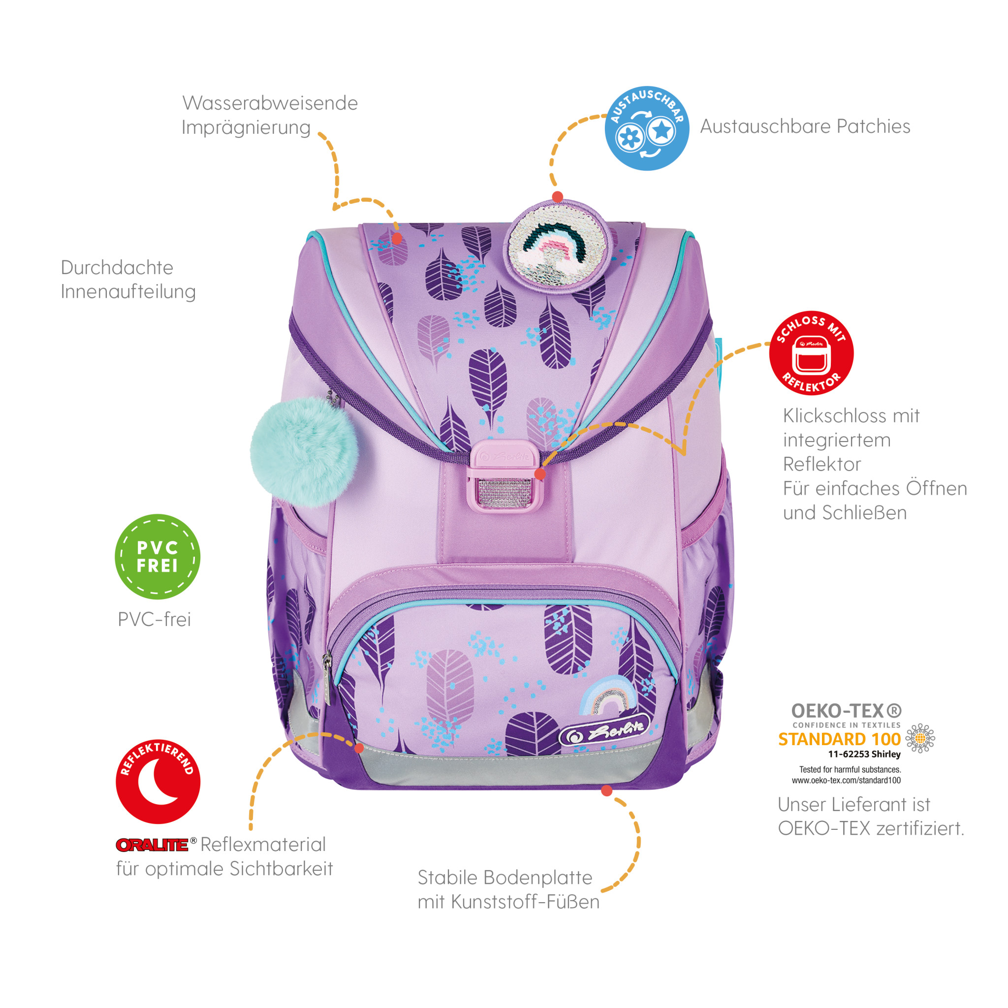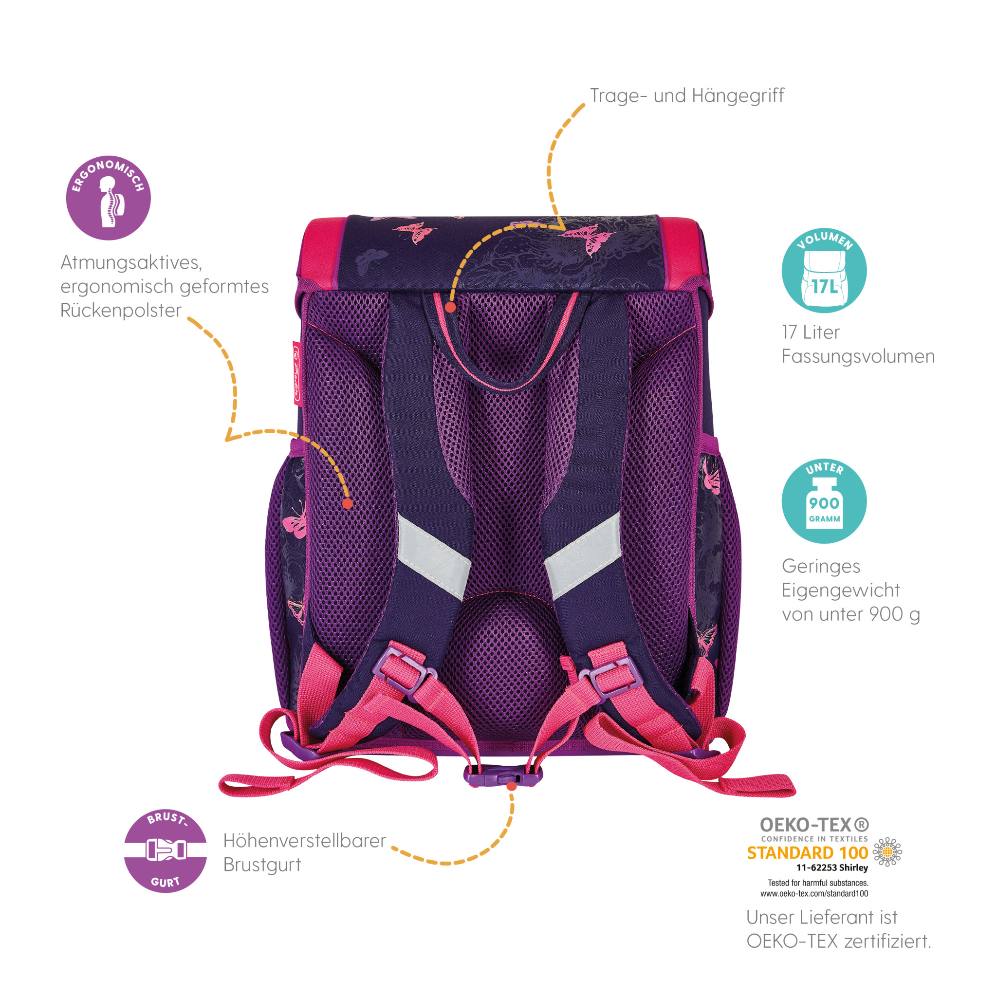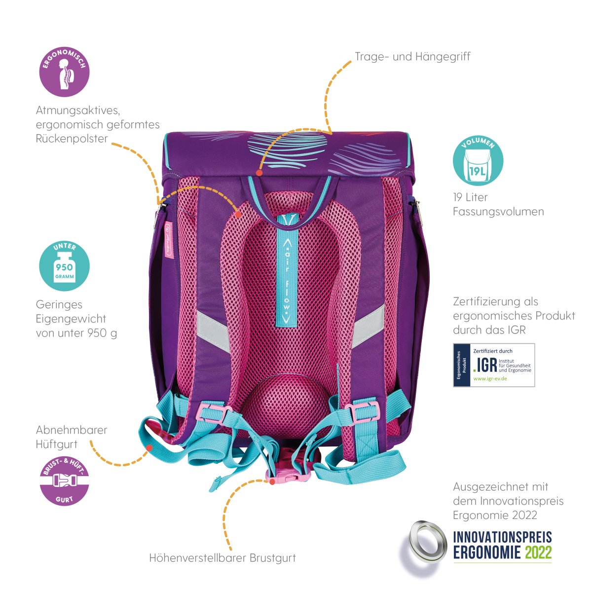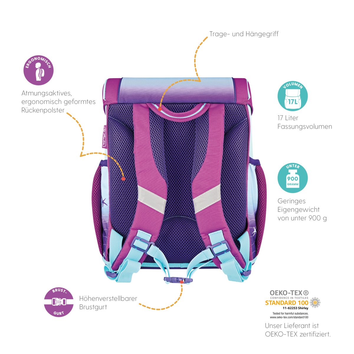 Schoolbag FiloLight Pink Stars backside, with Key Facts DE |