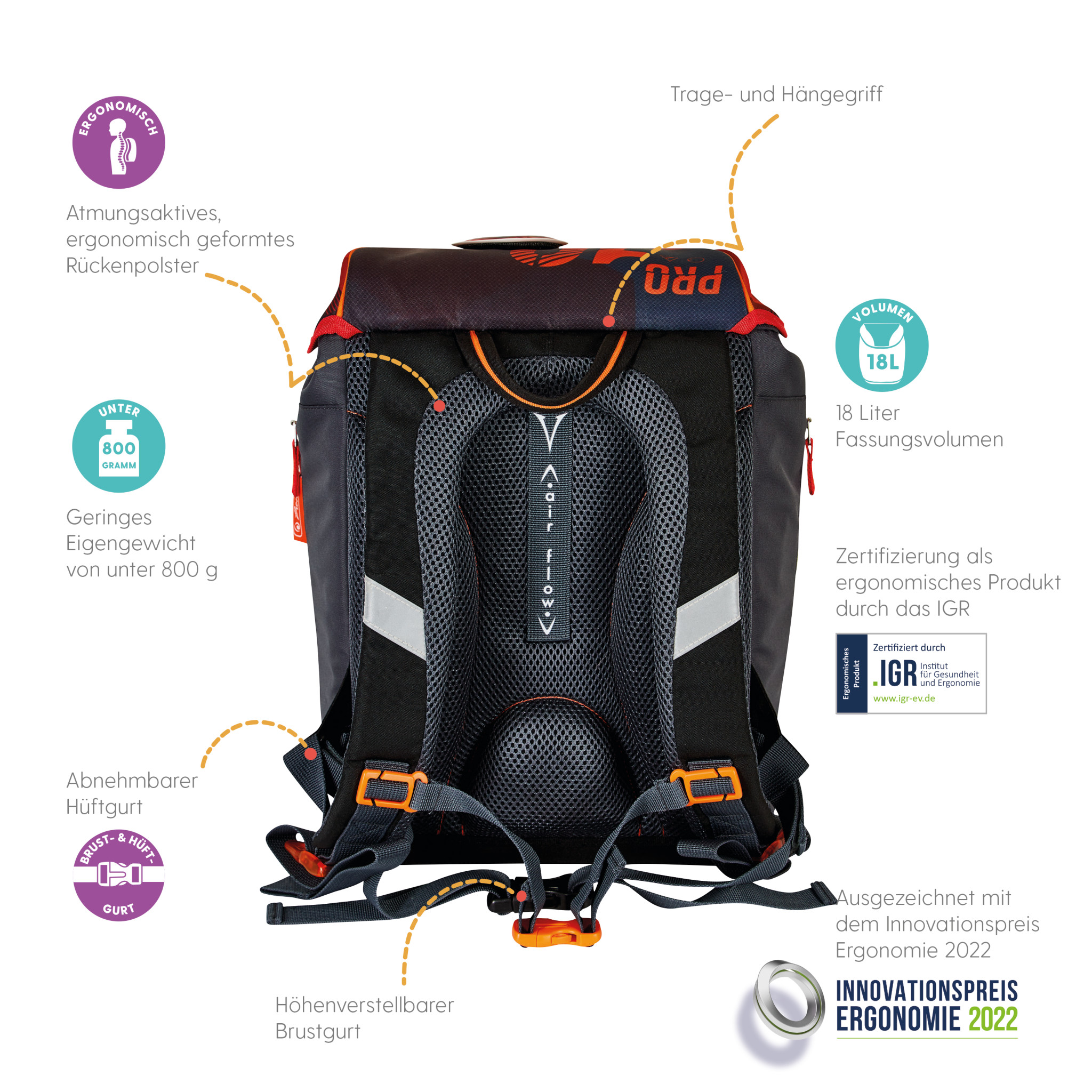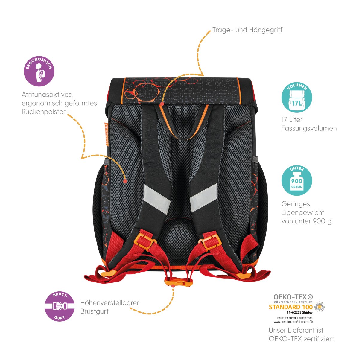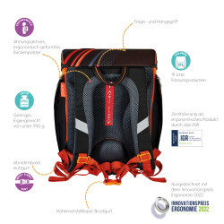 Schoolbag FiloLight Heavy Metal backside, with Key Facts DE |