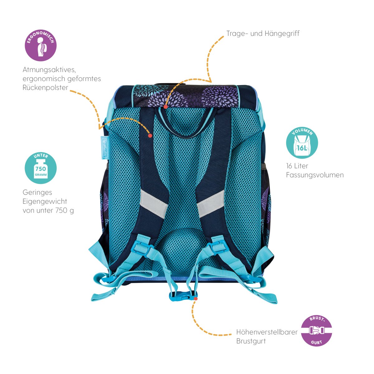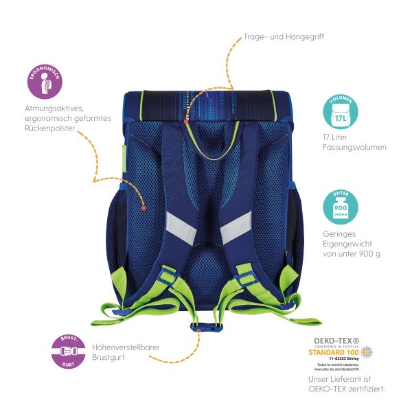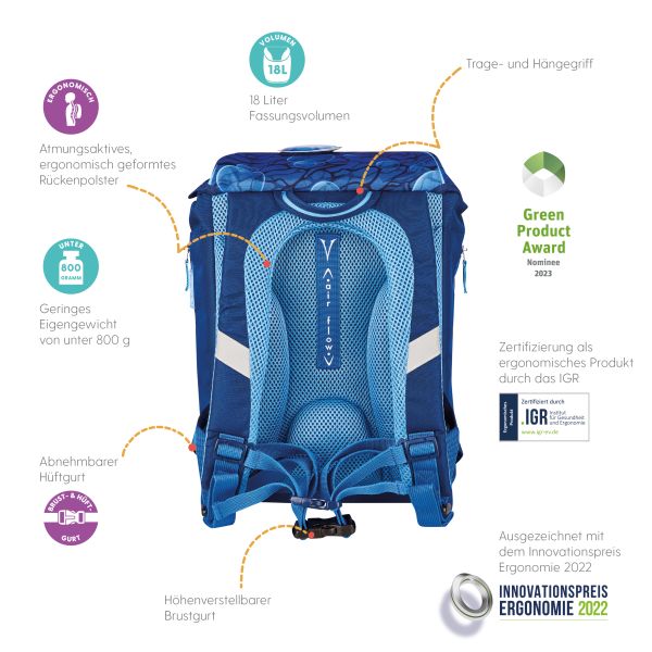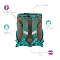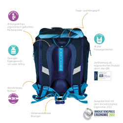 Schoolbag FiloLight Deep Sea backside, with Key Facts DE |