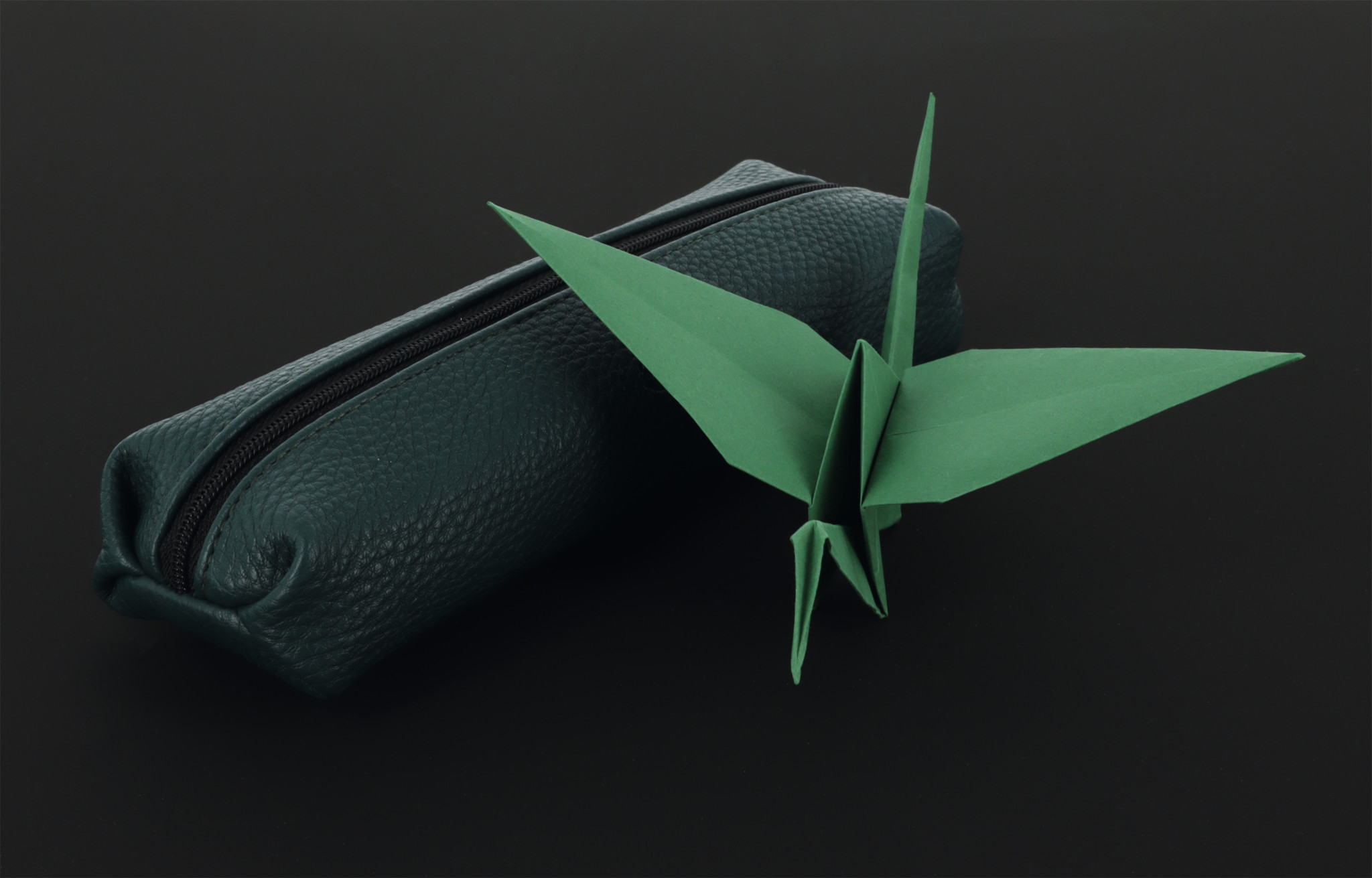 Pencil pouch Origami forest green, open with content |