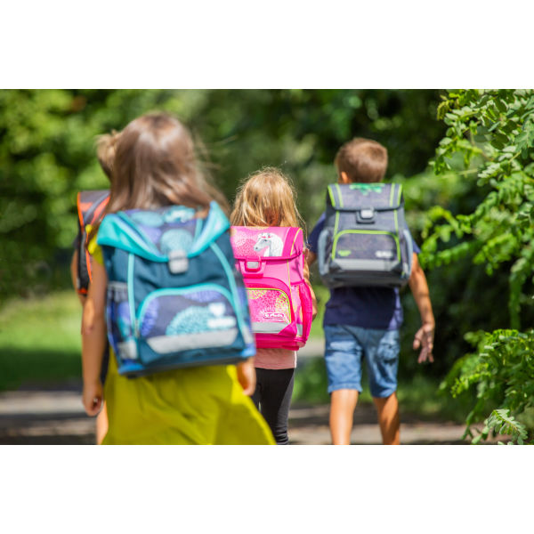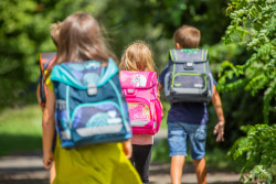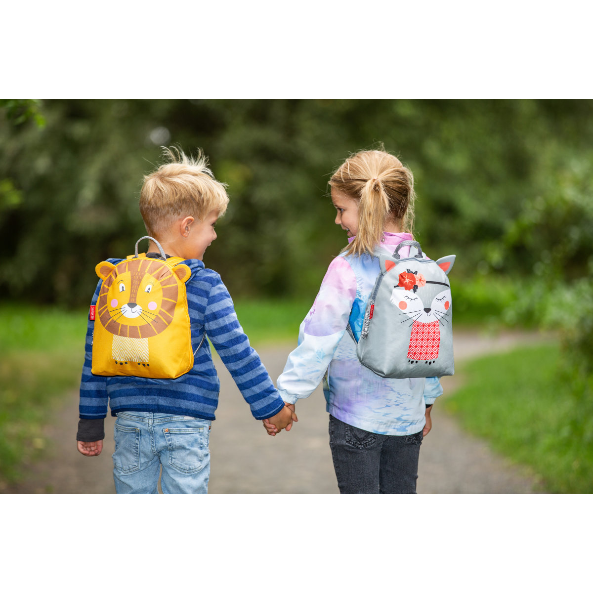 Kindergarten backpack, girl and boy hand in hand |