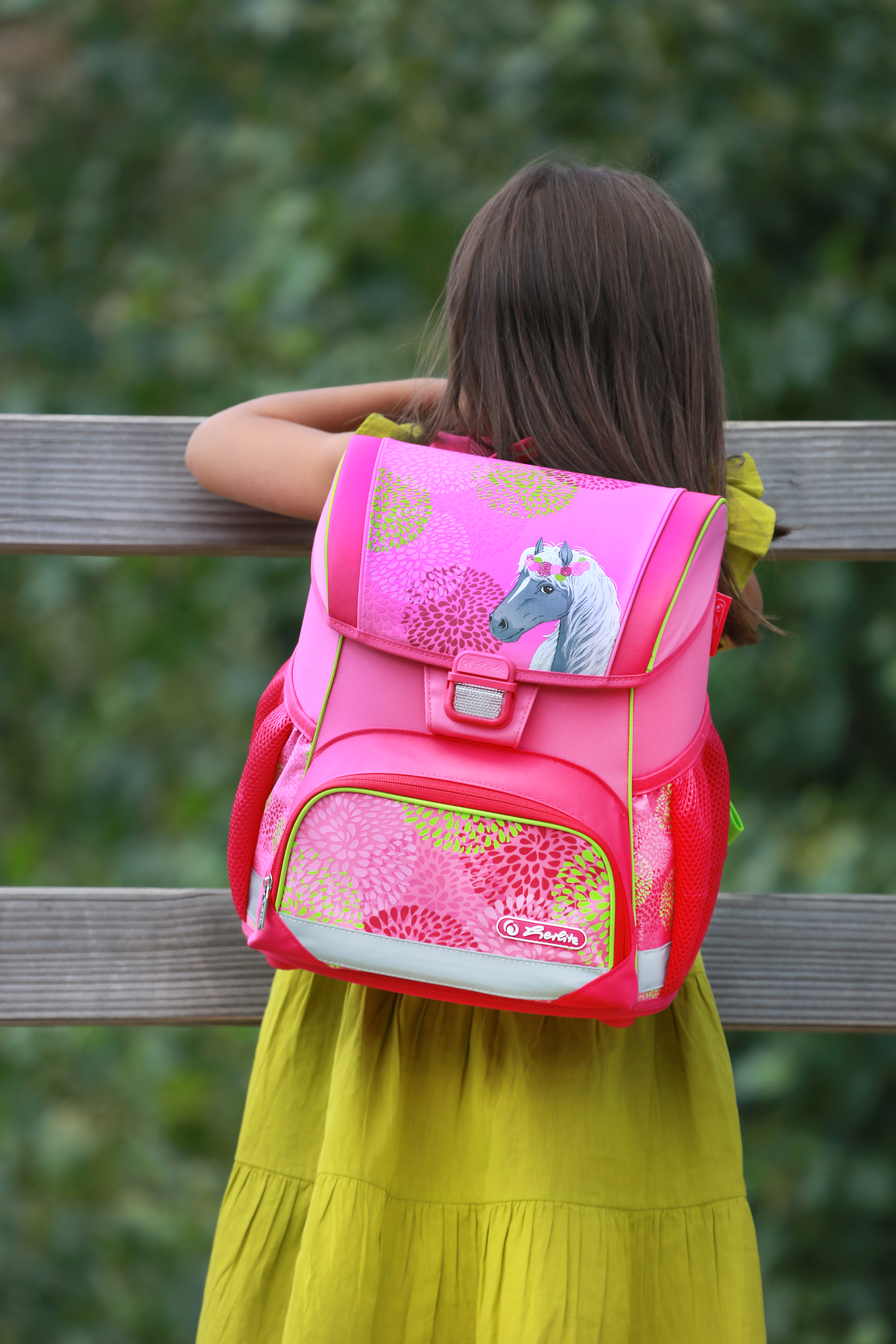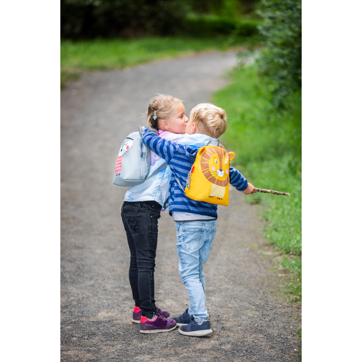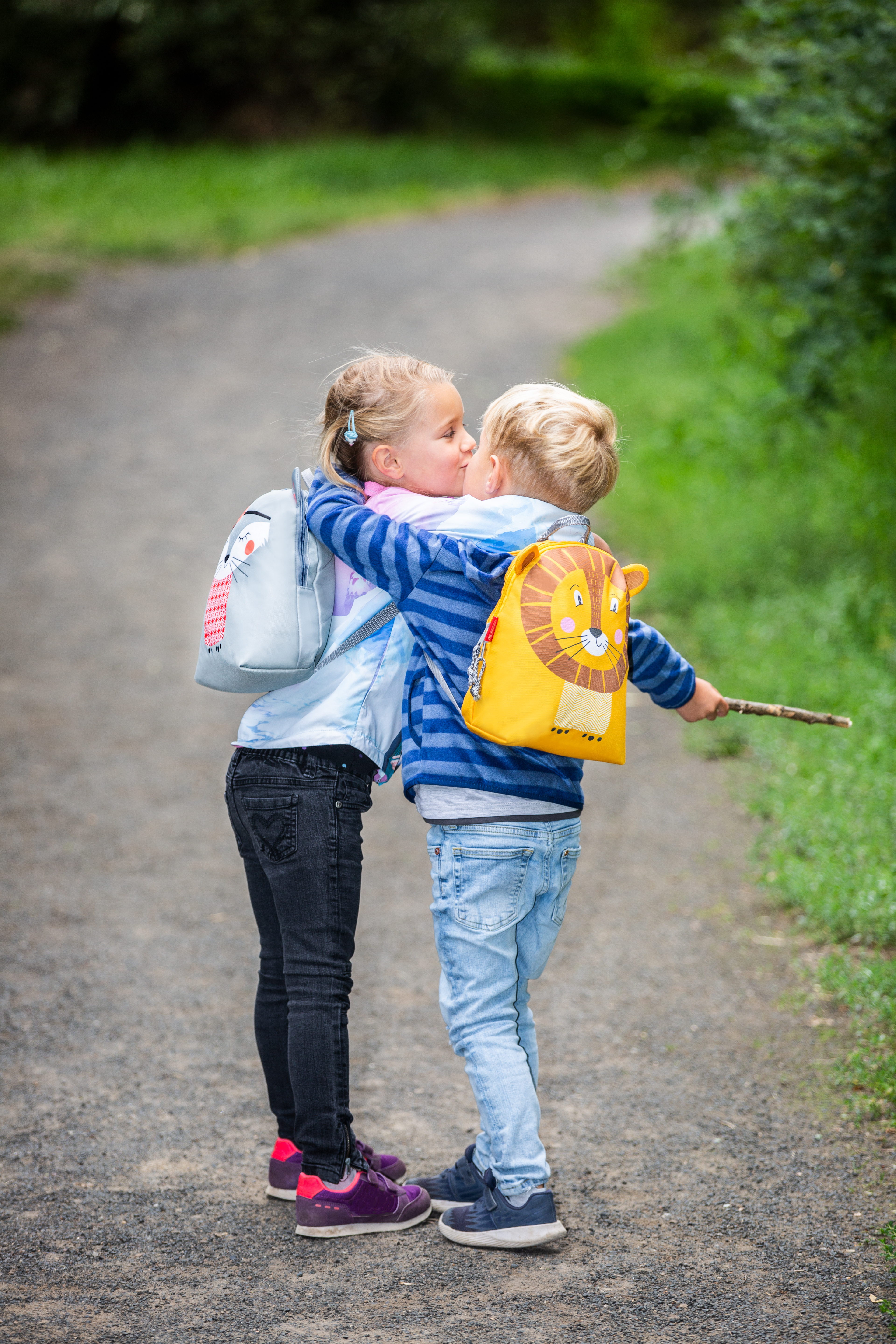 Kindergarten backpack, girl and boy kiss |