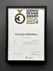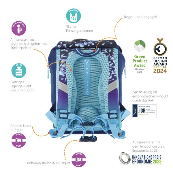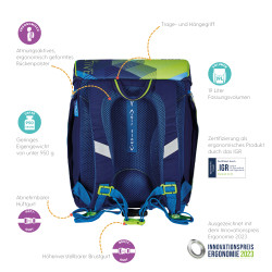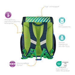 Primary school backpack SoftLight GREENline Deep Sea backside, with Key Facts DE |