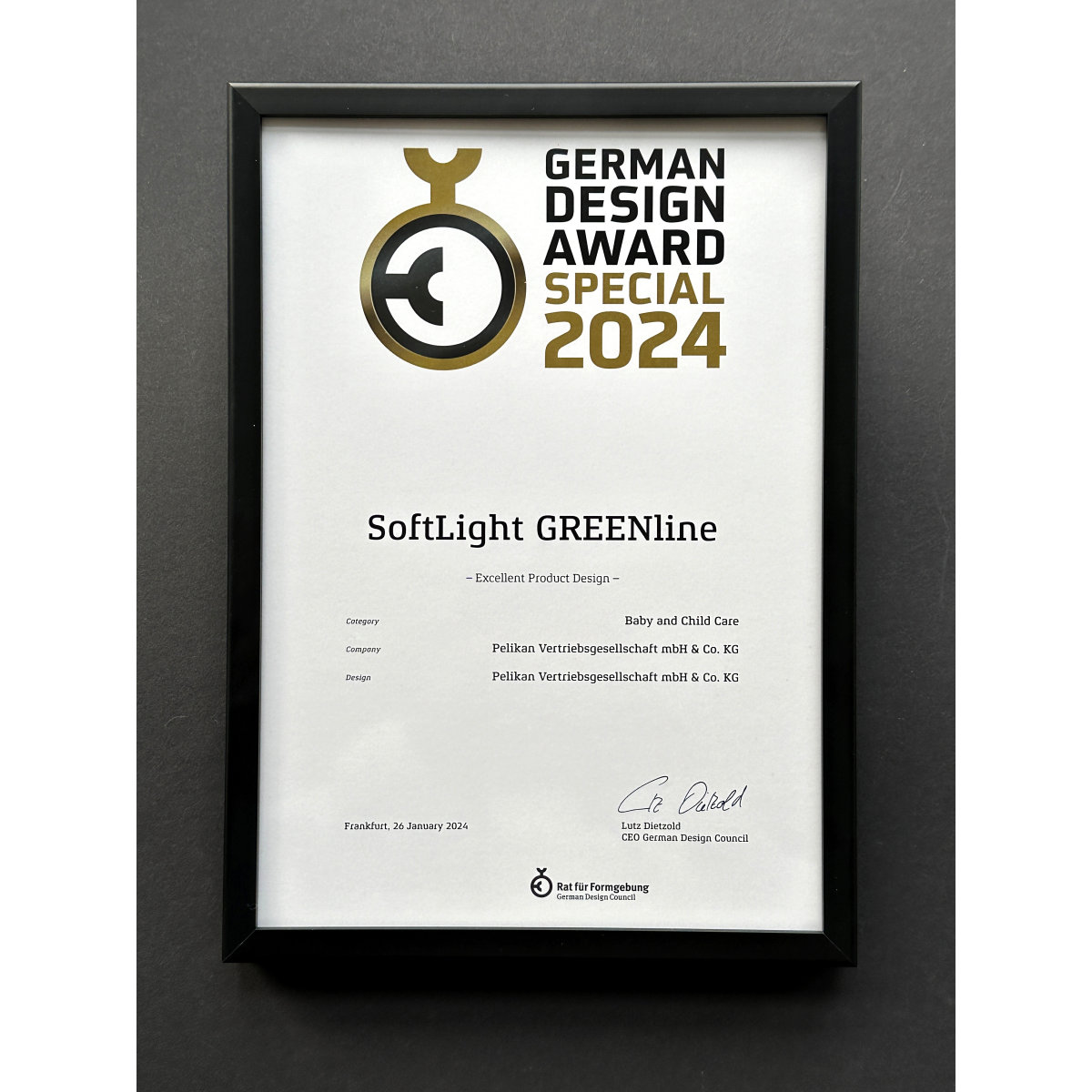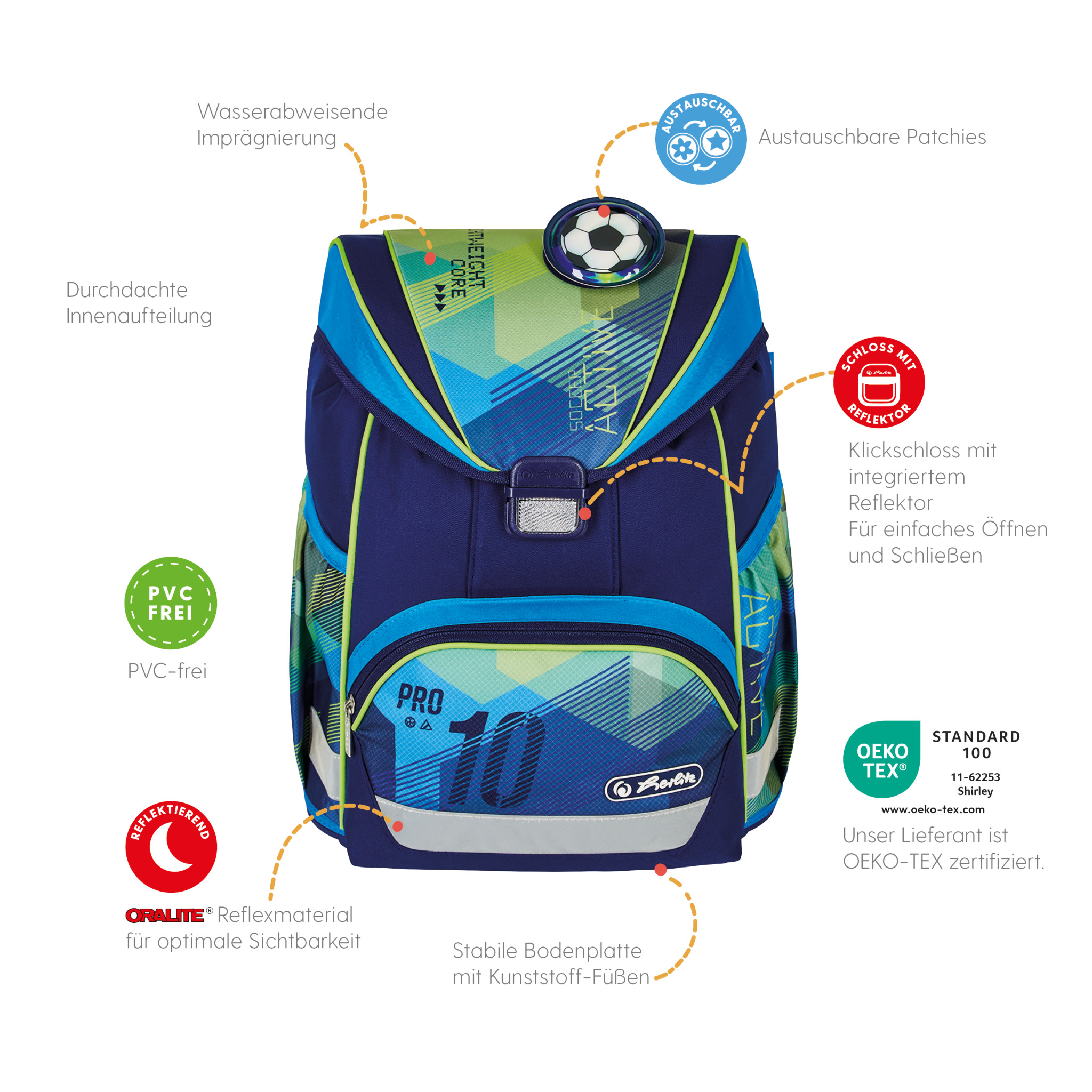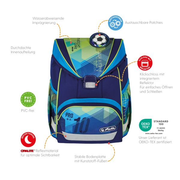 Schoolbag UltraLight Green Goal front, with Key Facts DE |