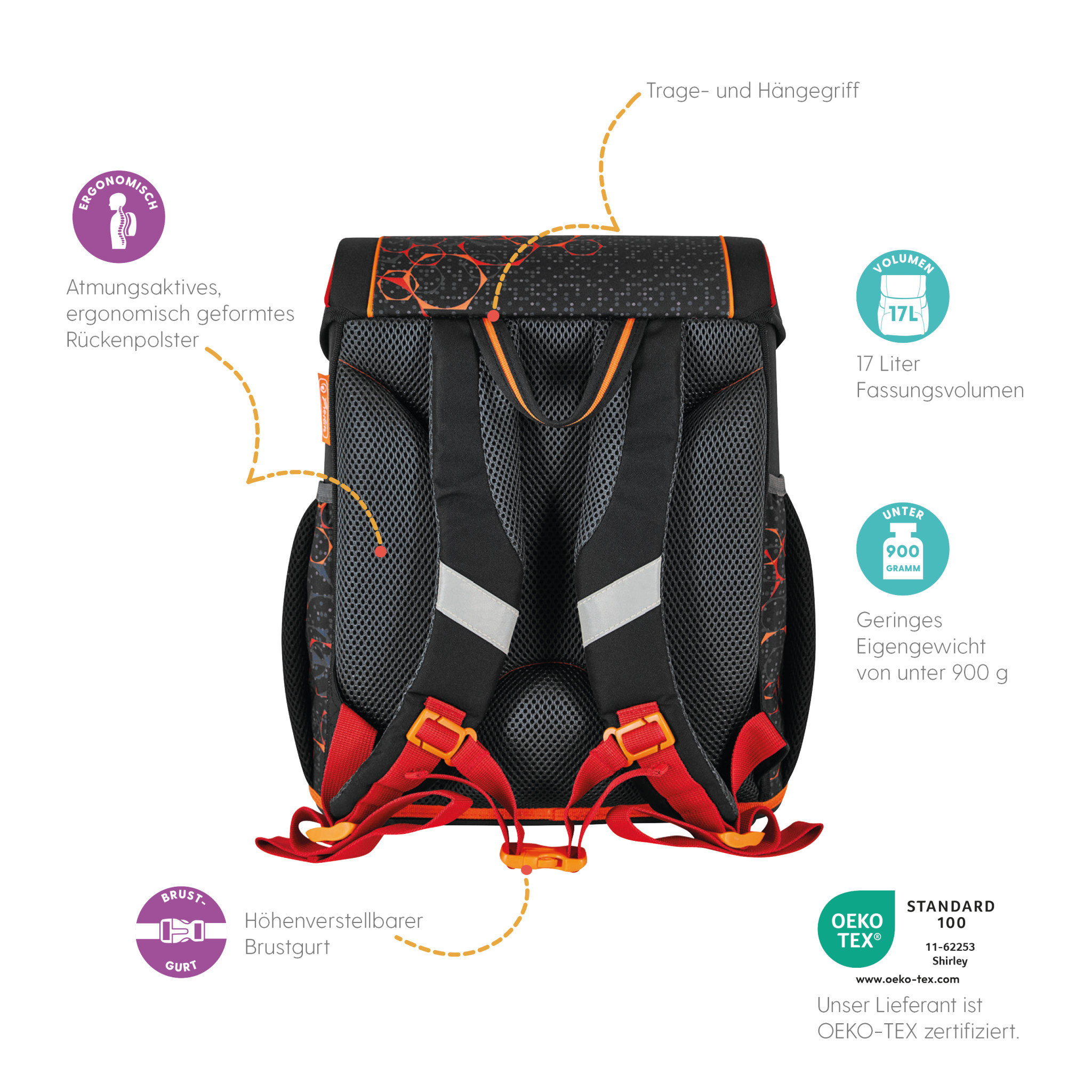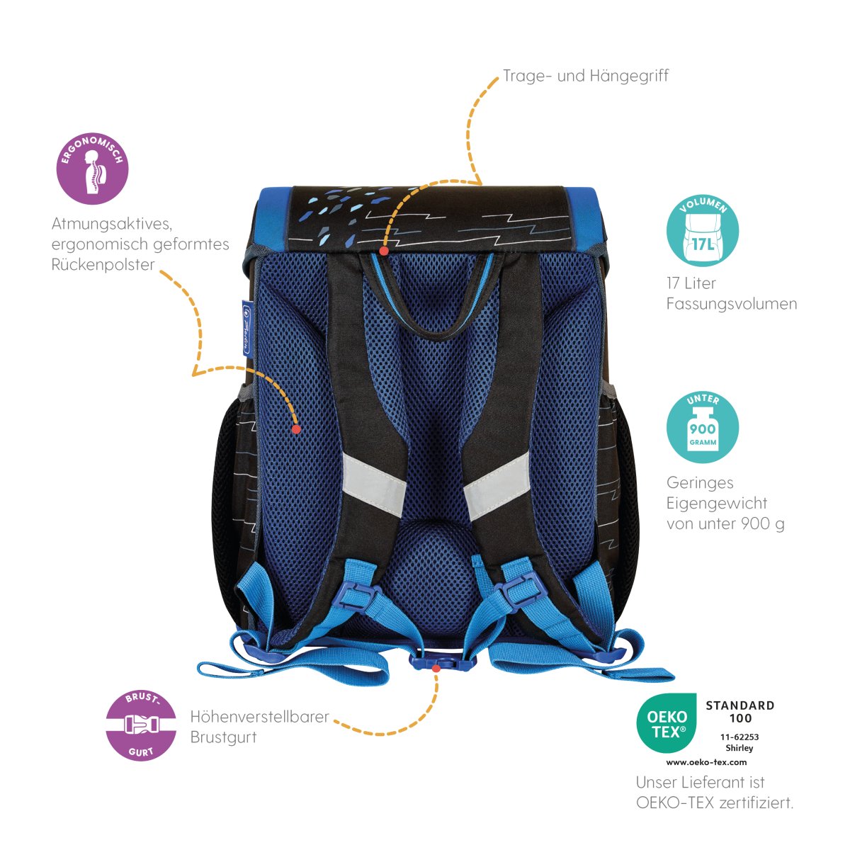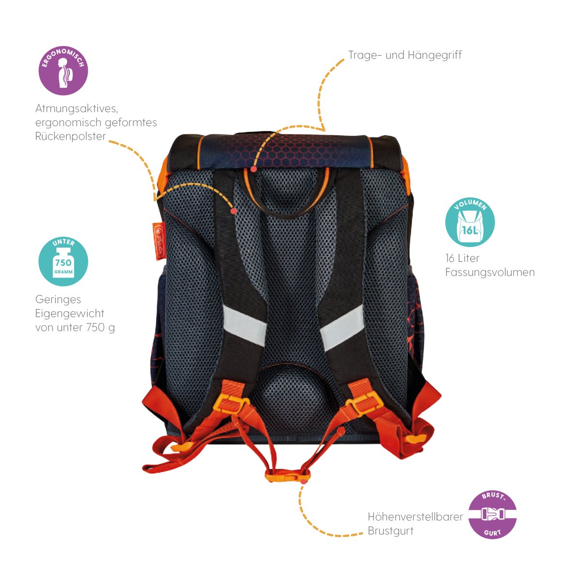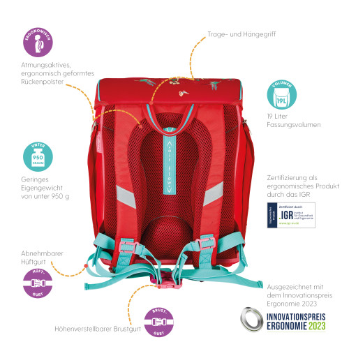 Schoolbag UltraLight Mechanic backside, with Key Facts DE |