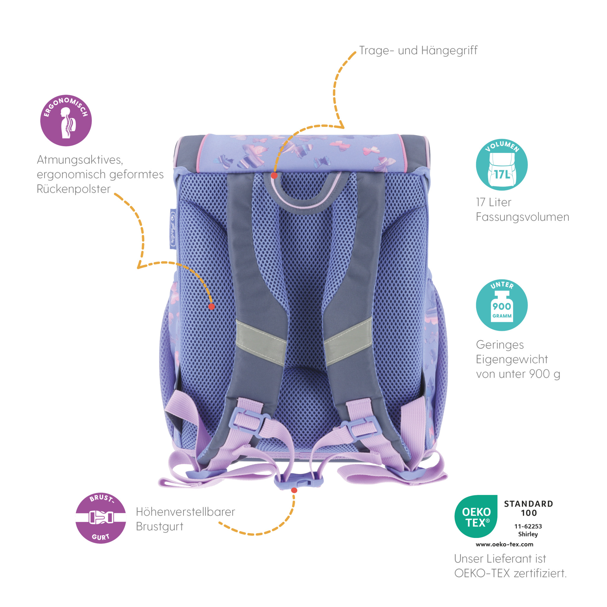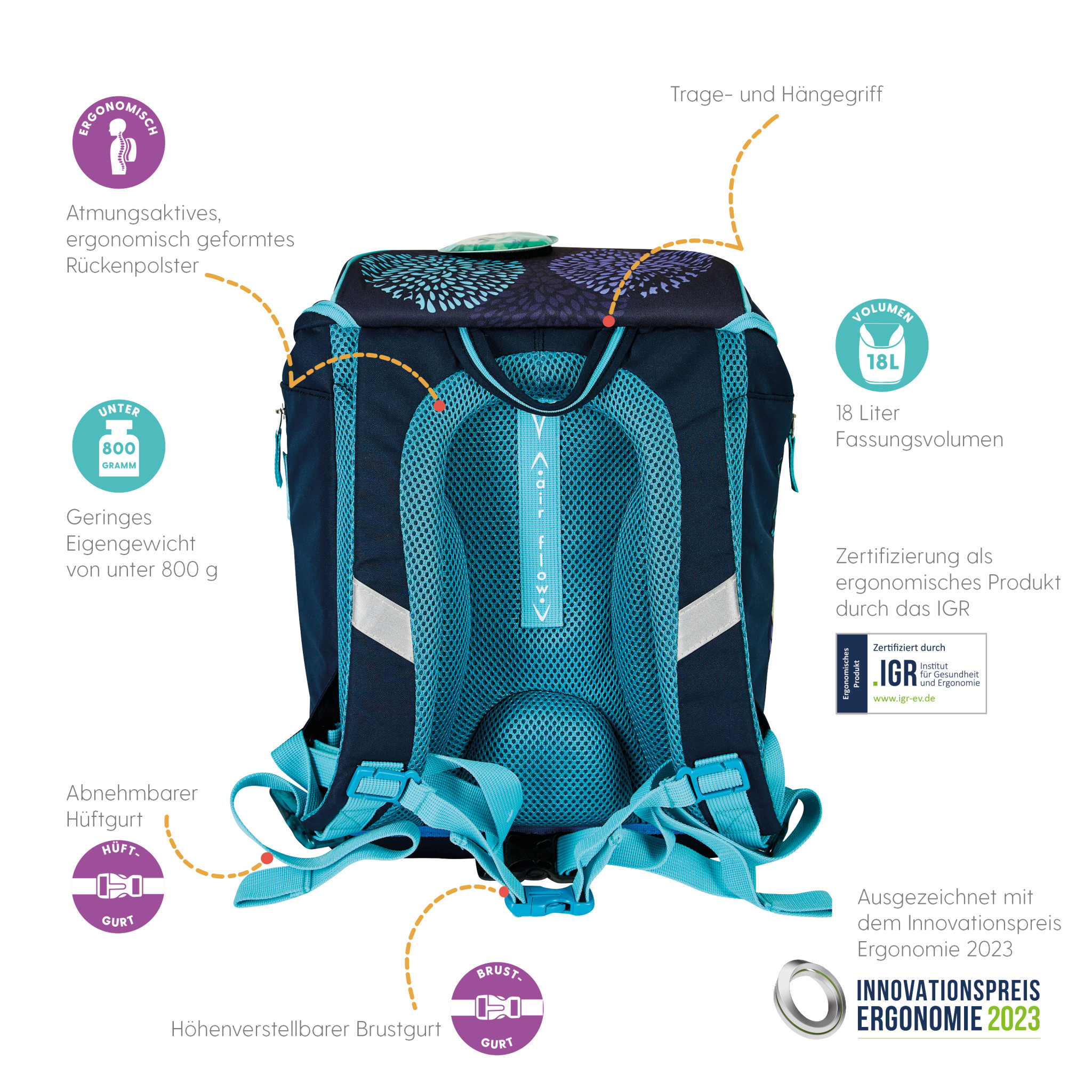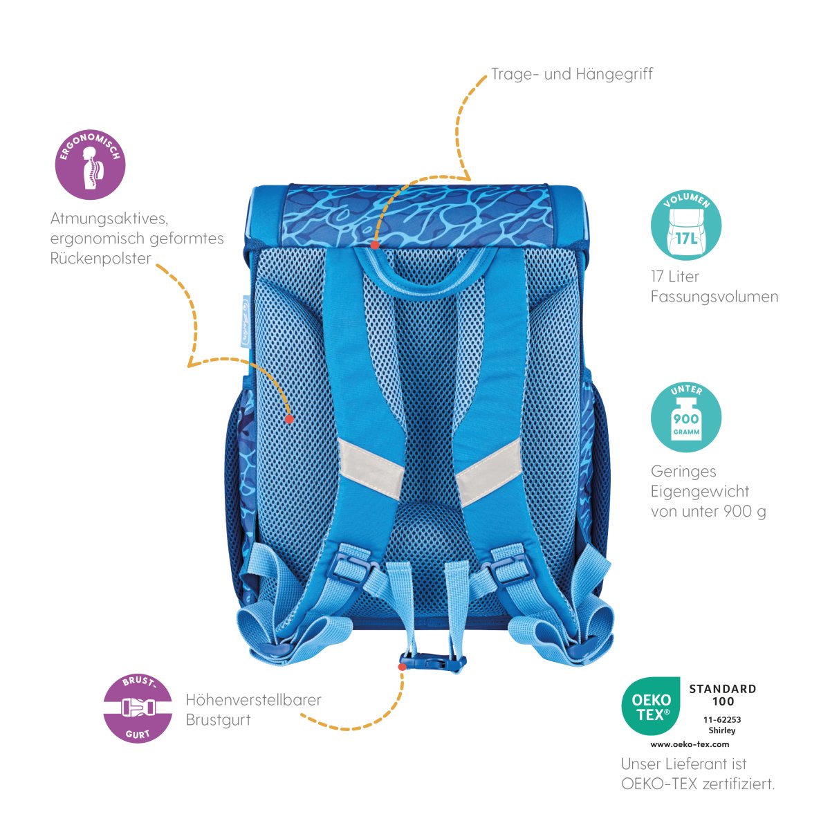 Schoolbag UltraLight Mechanic backside, with Key Facts DE |