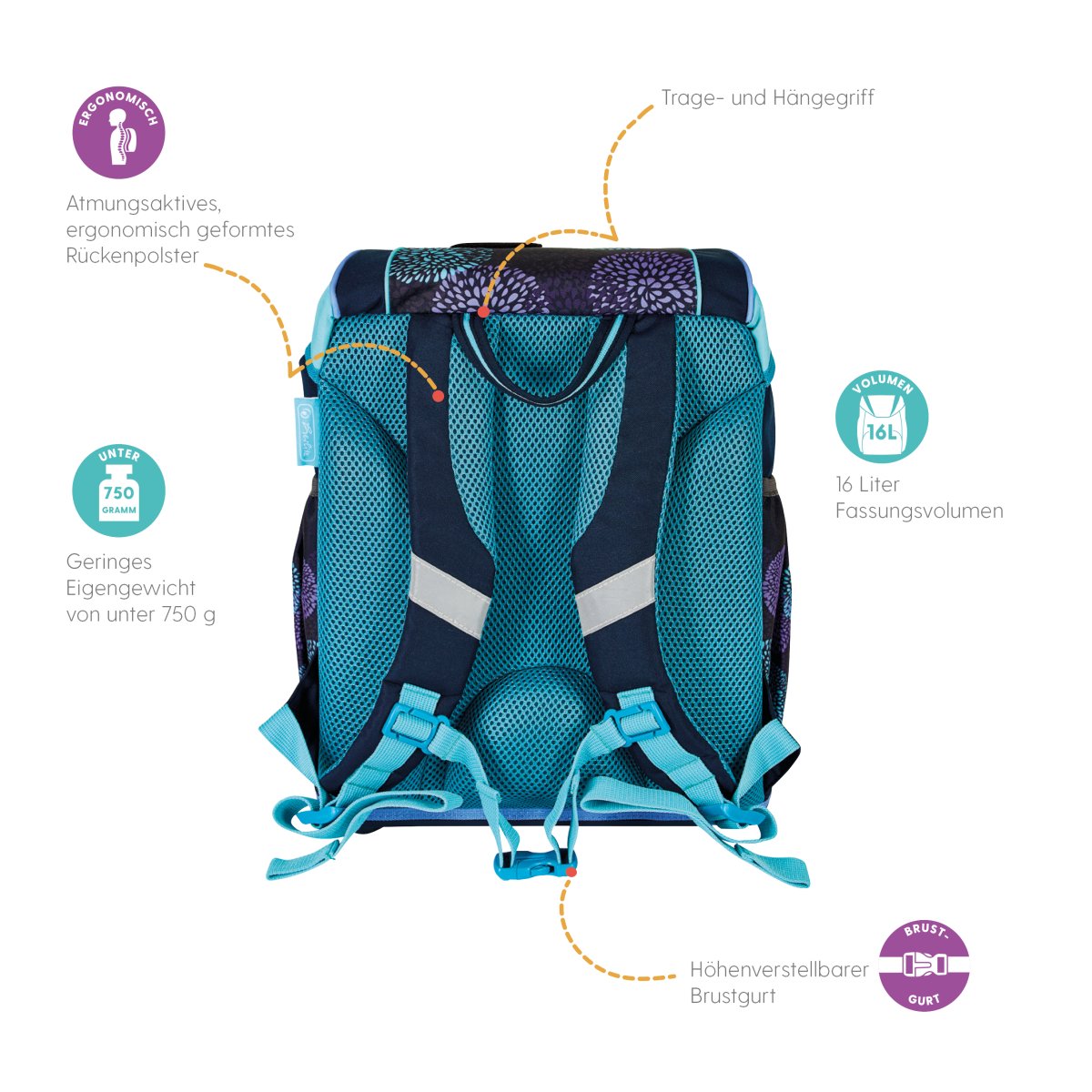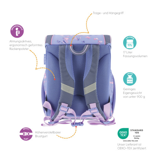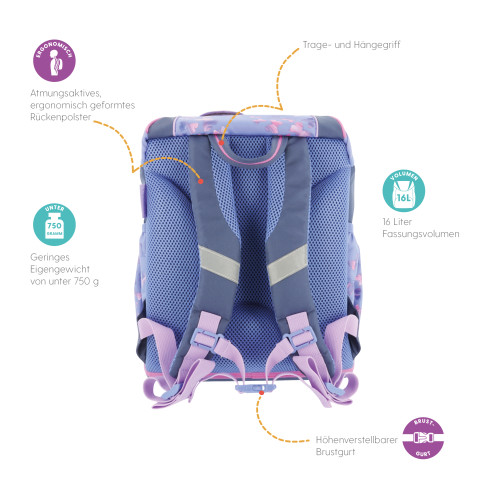 Primary school backpack SoftLight Bloomy Birds backside, with Key Facts DE |