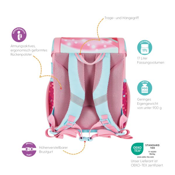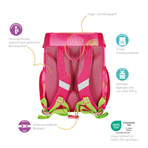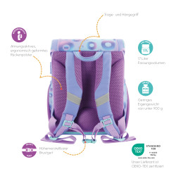 Primary school backpack SoftLight GREENline Pink Bubbles backside, with Key Facts DE |