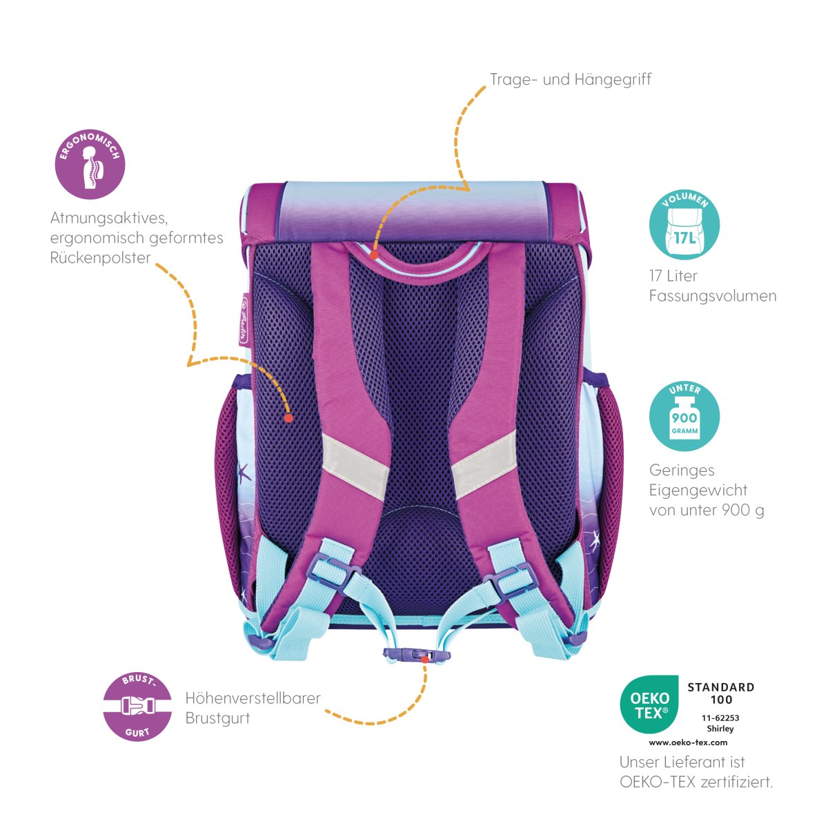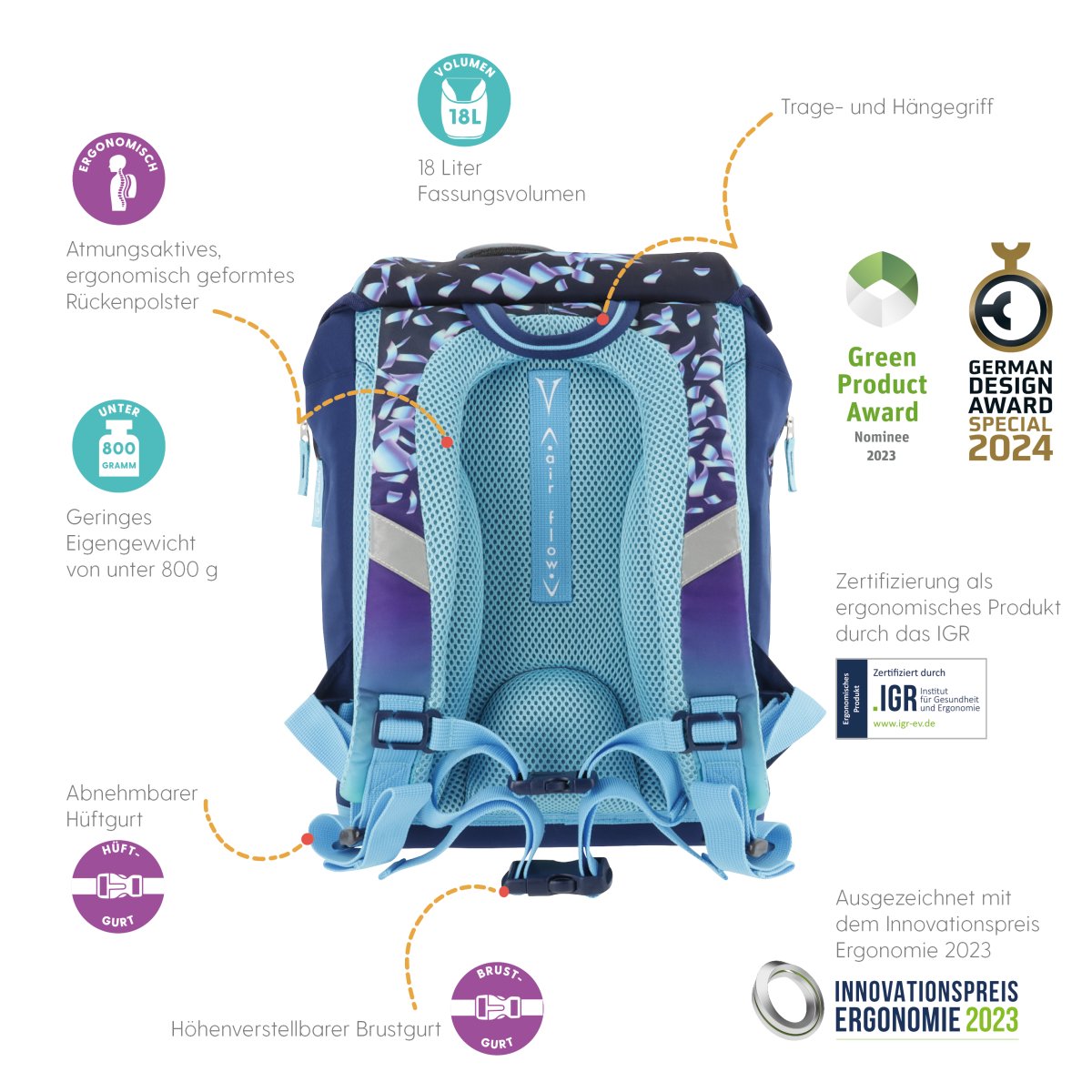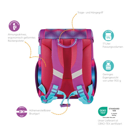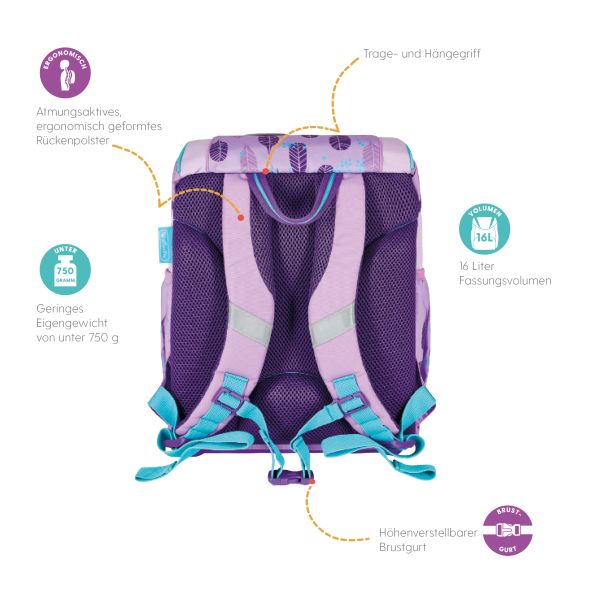 Schoolbag UltraLight Rainbow Feathers backside, with Key Facts DE |