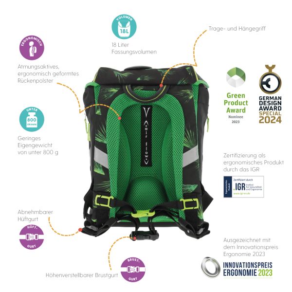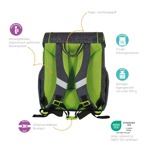 Schoolbag UltraLight Green Goal backside, with Key Facts DE |