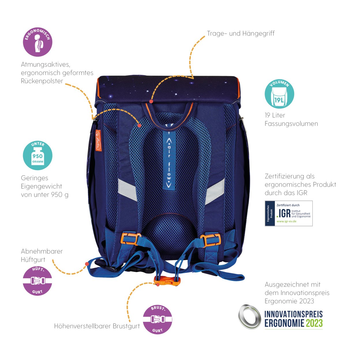 Primary school backpack SoftLight Space Boy backside, with Key Facts DE |