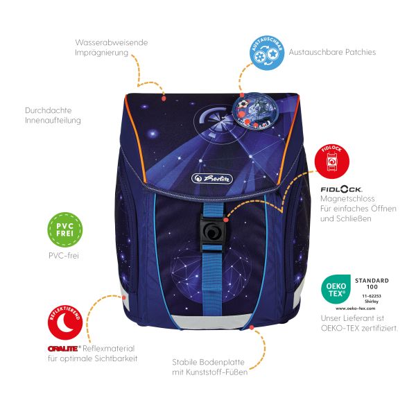 Primary school backpack SoftLight Space Boy front, with Key Facts DE |