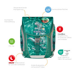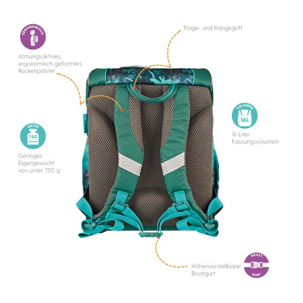 Schoolbag UltraLight Green Rex backside, with Key Facts DE |