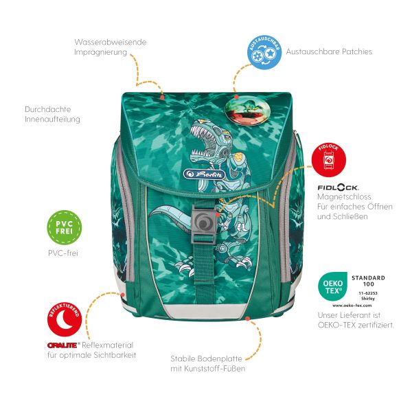 Schoolbag UltraLight Green Rex front, with Key Facts DE |